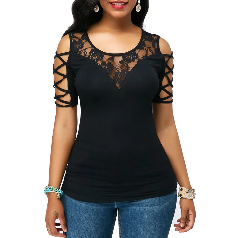 Женская летняя кружевная однотонная черная футболка с вырезами, Повседневная футболка с коротким рукавом, топы, футболки, одежда