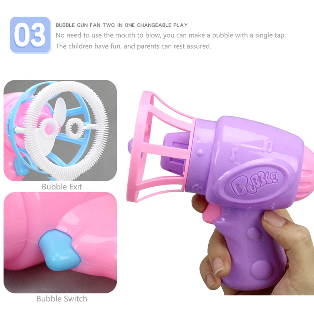 Изготовлен из мягкого материала, пузырьковый пистолет веер кусок гладкий и отполированный без края шипов. Вы можете сделать пузырь одним щелчком, а не использовать рот, чтобы дуть. Дети развлекаются, и родители могут быть уверены.