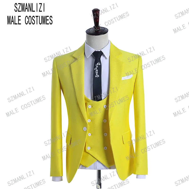 Модный дизайн, блестящий желтый мужской костюм, 2019, деловой костюм из 3 предметов, торжественное свадебное платье, Смокинги на заказ, свадебные костюмы жениха для мужчин