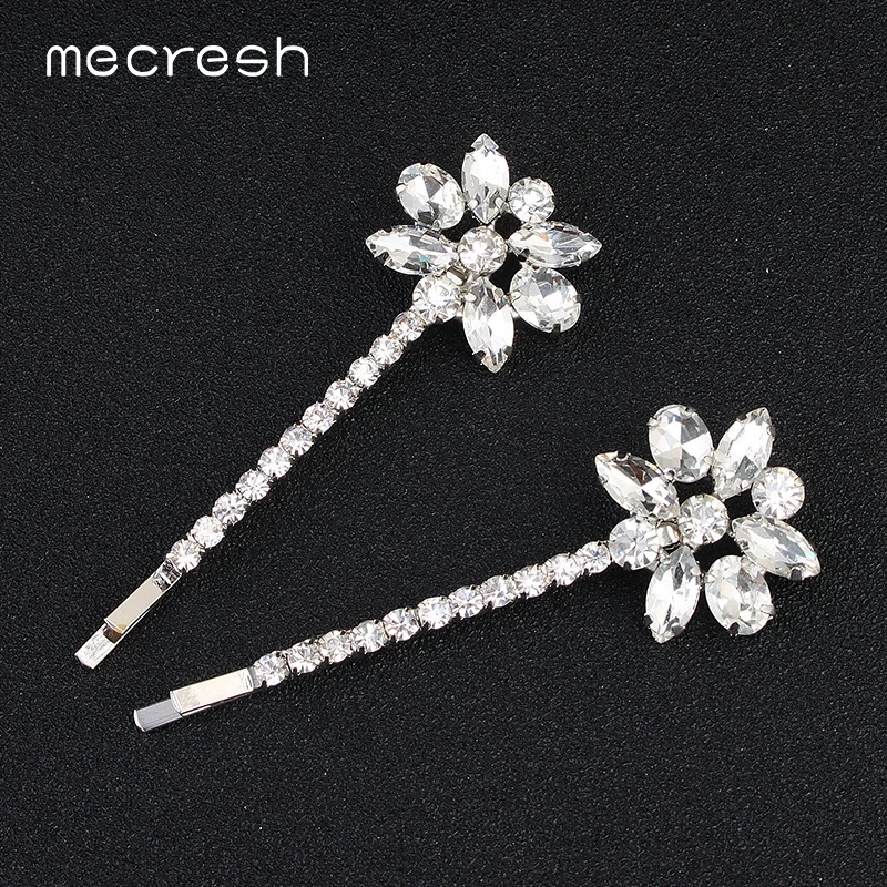 Свадебная заколка для волос с кристаллами Mecresh, заколка для волос серебристого цвета с цветами, украшения для волос, аксессуары для женщин, 2 шт./лот, MTS070