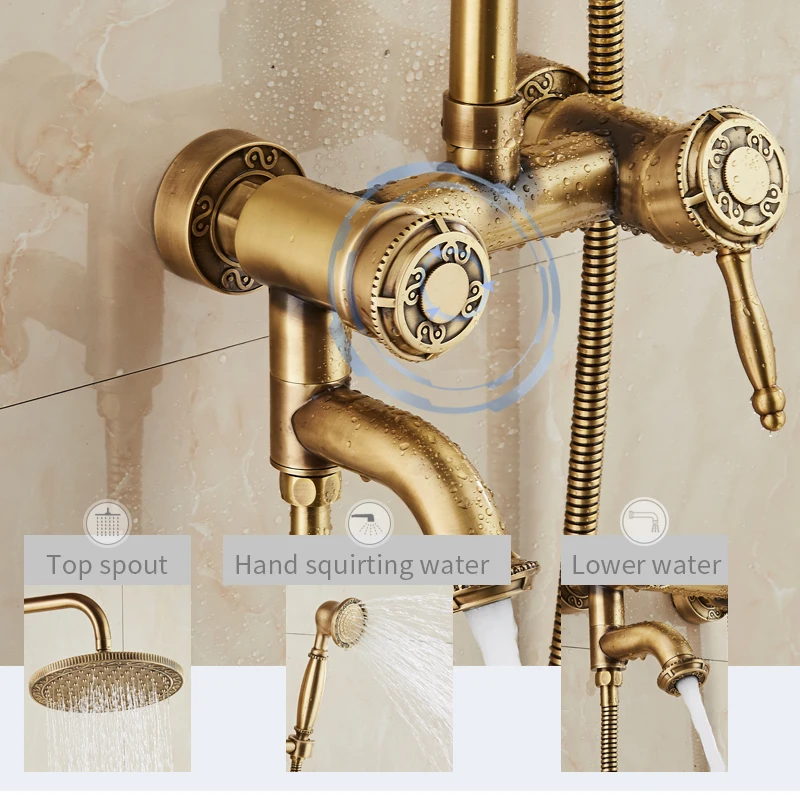JIKU латунный античный настенный набор для душа кран с двойной ручкой с ручной душевой + полка для ванной смеситель для душа