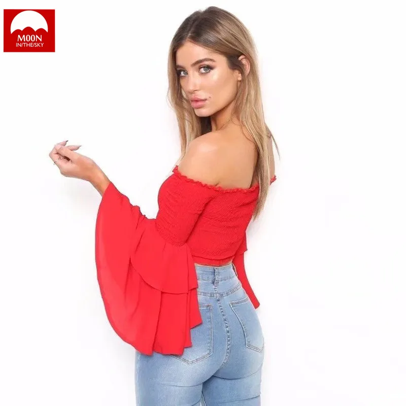 Новый летний эластичный Топ с одним плечом, короткий параграф, женская модная Однотонная рубашка с рукавами-колокольчиками, NZC-035