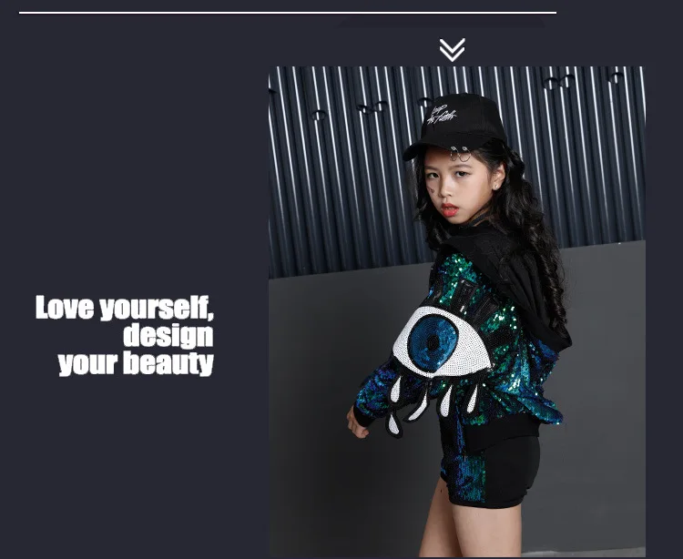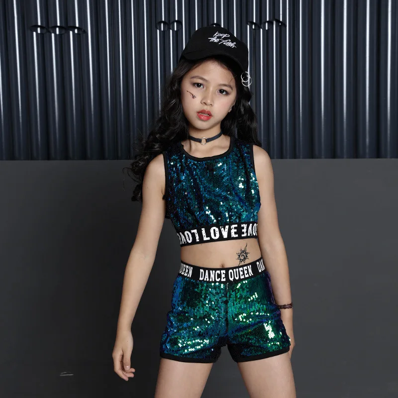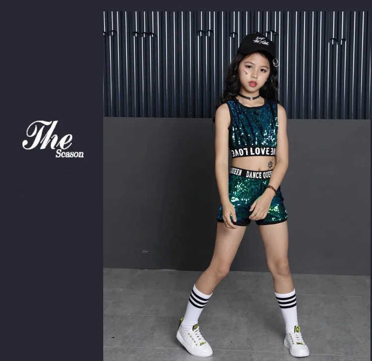 Сценические костюмы для девочек; Зеленая куртка с капюшоном и блестками на молнии; Укороченный топ на бретелях; Шорты; Комплект из трех предметов для детей