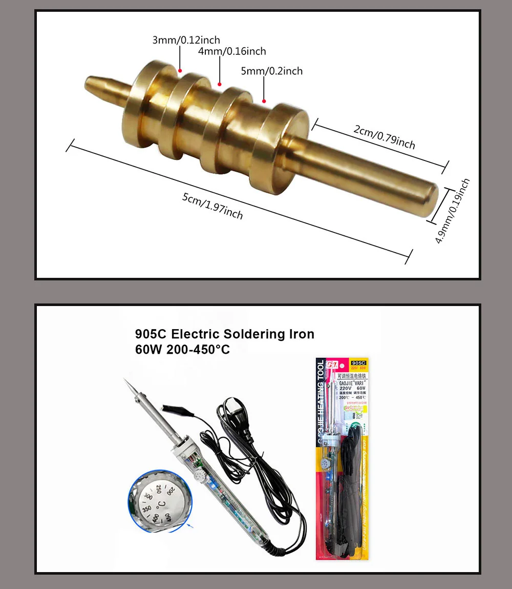 Название: Электрический фирменный утюг и гладильная головка для глажки кожи Контролируемый диапазон температур: 200 ~ 450 градусов Цельсия Спецификация: Одна Головка, 1 мм, 1,5 мм, 2 мм, 3 мм, 4 мм, 5 мм, 7 мм, 9 мм, Напряжение питания: 220 В 60 Вт Особенности продукта: Температура ручки низкая, чувствовать свет, электричество может быть минутной оловянной сварки, автоматическая температура, восстановление температуры. Нагревательный элемент легко заменить, эффективность высокая, а энергопотребление Низкое. Примечание: Пожалуйста, обратите внимание на безопасность в использовании, чтобы предотвратить ожоги.