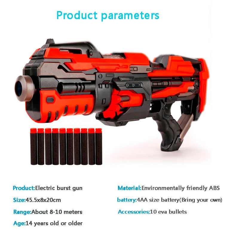1. Продукт: электрический пистолет для непрерывной съемки 2. Материал: экологически чистый АБС-пластик 3. Размер: 45,5*8*20 см 4. Дальность запуска: около 8-10 метров 5. Батарея: батарея размера АА (не входит в комплект) 6. Посылка включает в себя: игрушечный пистолет * 1, пули EVA * 10