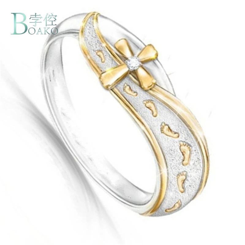 BOAKO 2019 Two-tone Cross Ring Silver Gold Color Footprint Clear Zircon Rings Female Wedding Engagement Lucky Ring Jewelry