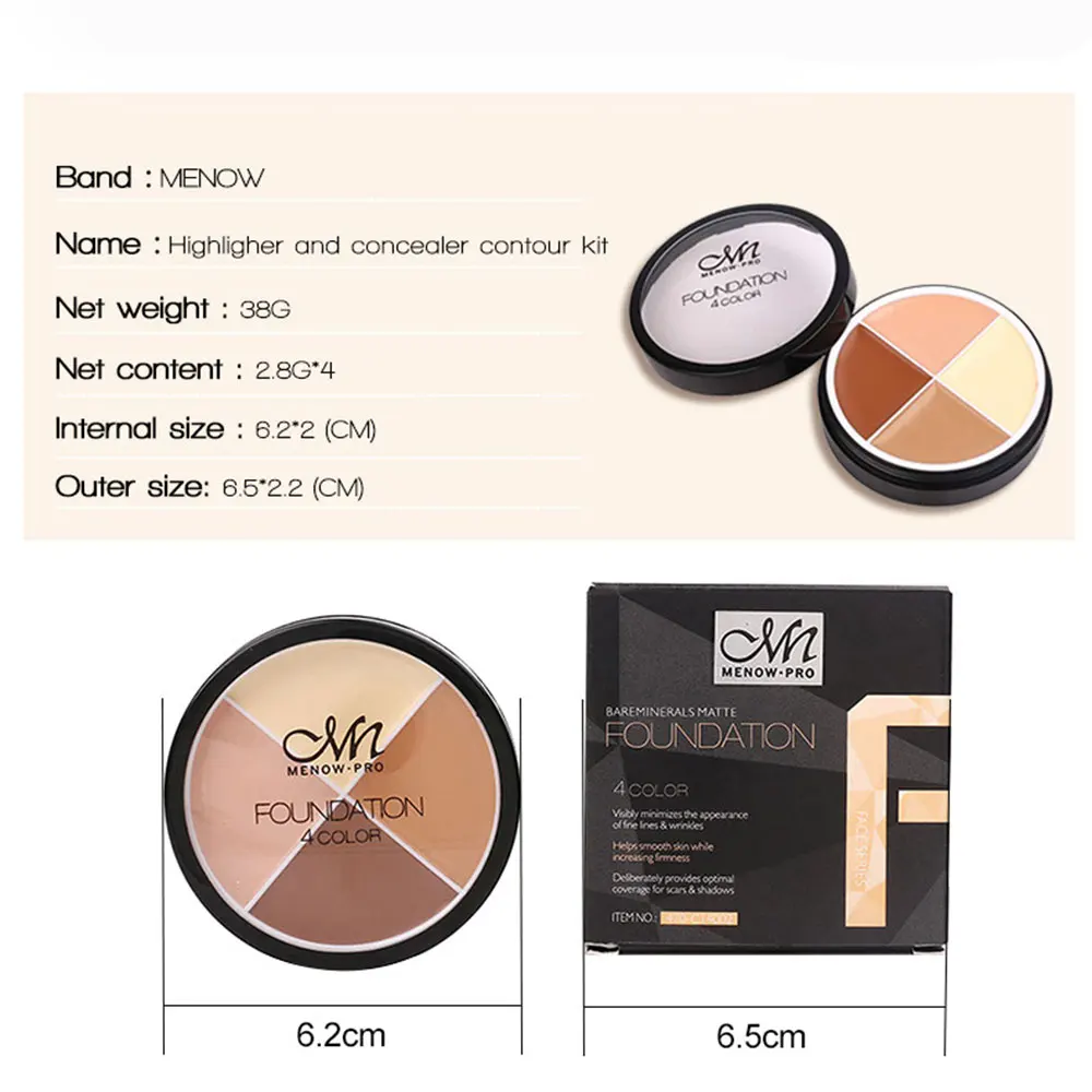 Палетка для контуринга с консилером для лица Профессиональная Косметика для макияжа с темным портом крем-основа для губ косметический инструмент для макияжа В последнее время существует новый популярный ориентир для девочек. Они нацелены на то, чтобы быть красивой Свинкой каждый день. Чтобы быть Свинкой, вы должны скрывать самые экстремальные недостатки на вашем лице. Наш продукт будет вашим лучшим выбором. Особенности: 4 цвета на ваш выбор. Этот уникальный макияж обеспечивает средний и полный охват. Прекрасно стирает неровности кожи и несовершенства. Заметно минимизирует появление тонких линий и морщин. Помогает гладкой коже, повышая упругость. Специально обеспечивает оптимальное покрытие шрамов и теней. Такие как шрамы, тяжелые повреждения кожи, пятна красоты. Самый мощный консилер может скрыть темные круги, пятна и неровную пигментацию, чтобы создать идеальный естественный макияж. Осветляет и маскирует, концентрируется в одном шаге, отливает невидимую магию. Это будет интимный подарок для ваших семей и друзей. Применение: нанесите на несовершенства, такие как темные круги или темные пятна, аккуратно Смешайте с кончиками пальцев. Ингредиент: Изододекан, озокерит, нефрлатум, циклометикон, этилгексил пальмитат, Минеральное масло, изопропил миристата, триметилсилоксисиликат, пчелиный воск, Cera Microcristallina,Squalane,Lanolin,Tridecyl trimelliate, Mica, Silica,Propylparaben,BHT,BHA,Parfum, может содержать [CI 77891,CI 77491,CI 77492,CI 77499]. Технические характеристики: Наименование: контурный набор хайлайтера и консилера Цвет: 4 стиля на ваш выбор (01 # или 02 # или 03 # или 04 #) Вес нетто: 38 г/1,34 унций Вес нетто: 2,8 г * 4/0,01 oz * 4 (каждый ПК) Диаметр этого продукта: 62 мм/2,44 дюйма Высота: 20 мм/0,79 дюйма Посылка Размер: 65*65*22 мм/2,56*2,56 * 0.87in Вес посылка: 40 г/1,41 унций Внимание: только для наружного использования, Избегайте контакта с глазами. Храните его в тени и держите в недоступном для детей месте. Посылка в комплект входит: 1 * Корректор "Menow" Палитра (01 # или 02 # или 03 # или 04 #)