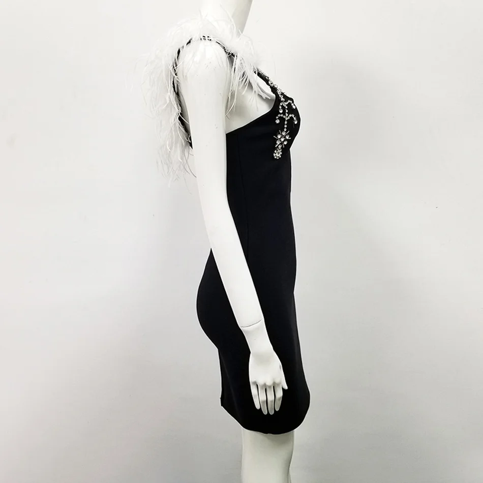 | Детали | Сексуальное вискозное Бандажное платье имеет яркий вырез с открытыми плечами и действительно подчеркивает фигуру в виде песочных часов. Платье с асимметричным разрезом на одно плечо, украшенное стразами и перьями, обнимает ваши изгибы и удлиняет мини-длину. | |