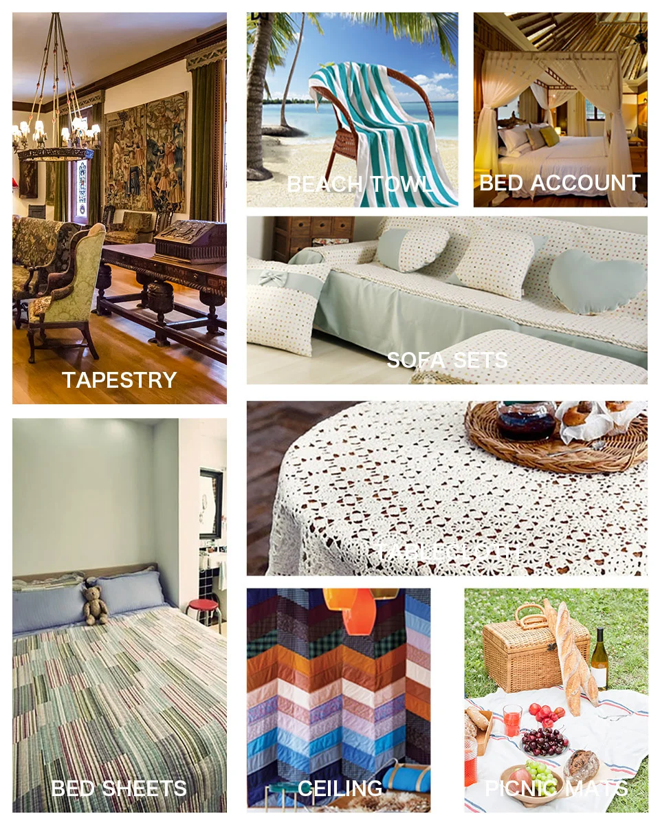 Использование:Гобелен, пляжное полотенце, учетная запись кровати, наборы диванов, скатерть, простыни, потолок, коврики Piclinc