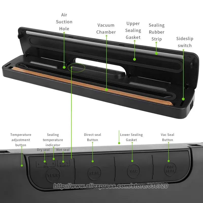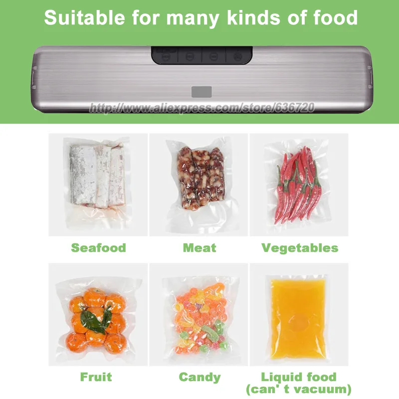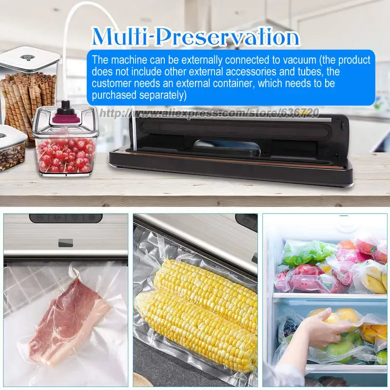 Высокого качества вакуумный упаковщик может быть использован для специальных вакуумных контейнеров и поставляется с несколькими насадками: посылка коробка/вакуумный упаковщик/115 специальные вакуумные пакеты (7,87*9,84 дюйма)/с вакуумными трубками (19,68 дюймов)/Длинный зарядный кабель/руководство по эксплуатации. Выберите правильную температуру для разной толщины вакуумных пакетов, более низкую температуру для тонких мешков и более высокую температуру для плотные пакеты.