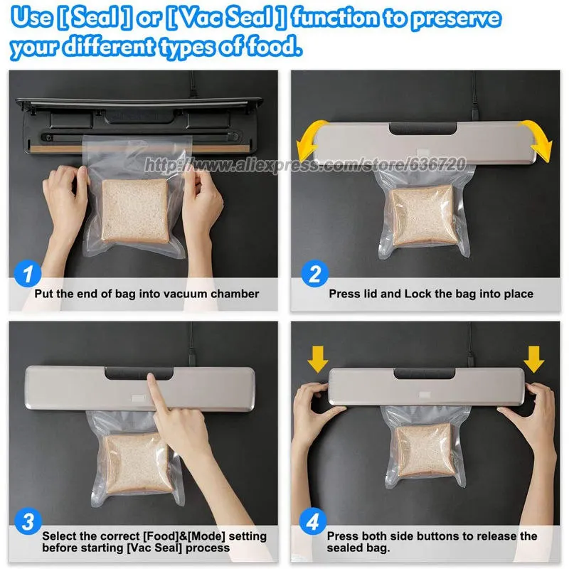 Положите запечатанный пакет в середину уплотнительного стержня, Конец Мешка должен быть примерно на полпути к «вакуумному уплотнительному Порту», оставьте место для всасывания, И протрите пятна воды. Приготовьтесь к вакууму и уплотнению, закройте верхнюю крышку и закрепите кнопки с обеих сторон. Нажмите кнопку вакуумного уплотнителя, пищевой упаковщик автоматически прокачивает весь воздух в пакете и запечатывает его. Потяните за боковую пряжку, затем вы получите Запечатанные вещи.