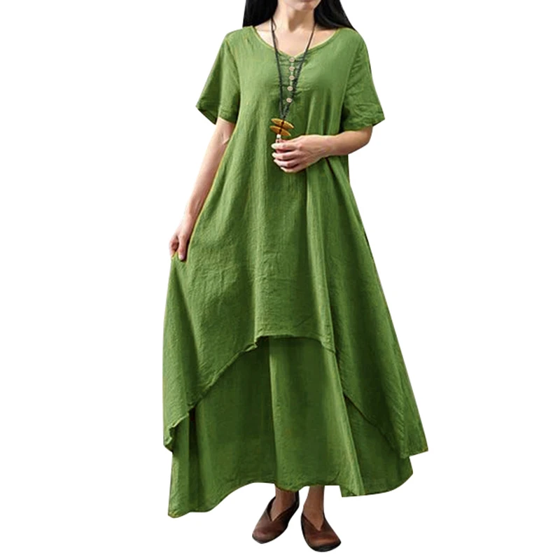 Это Свободное длинное платье в стиле бохо станет чем-то особенным в этом сезоне. Это подчеркивает v-образный вырез с декоративными пуговицами внизу, короткими рукавами и асимметричным многослойным подолом, чтобы сделать его немного шикарным. Идеально сочетается с ожерельем в этническом стиле.
