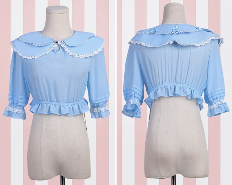Женская блузка в Стиле Лолита, короткий топ, розовый, синий, бежевый, шифон, воротник Питер Пэн, Летний джемпер