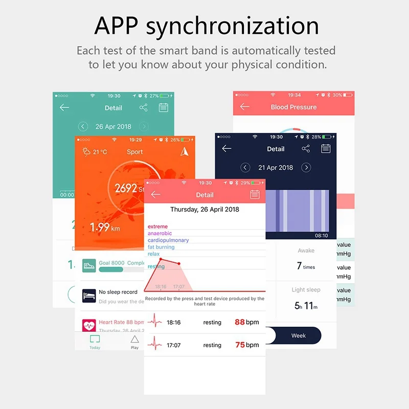 6. функции: пульс, кровяное давление, спортивный шагомер, калории, мультиспортивные модели, будильник, входящие звонки, информация, напоминание о сидячем положении, facebook, twitter, мониторинг сна, камера дистанционного управления, анти-потеря, один клик повесить, поднять экран