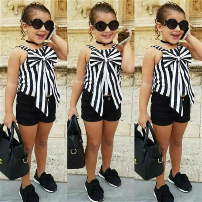 2 шт., летняя одежда для девочек, новинка 2019 года, летняя одежда для маленьких девочек, топ без рукавов с бантом, рубашка, шорты, комплект одежды, От 1 до 6 лет!