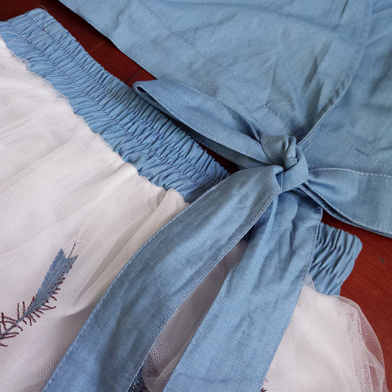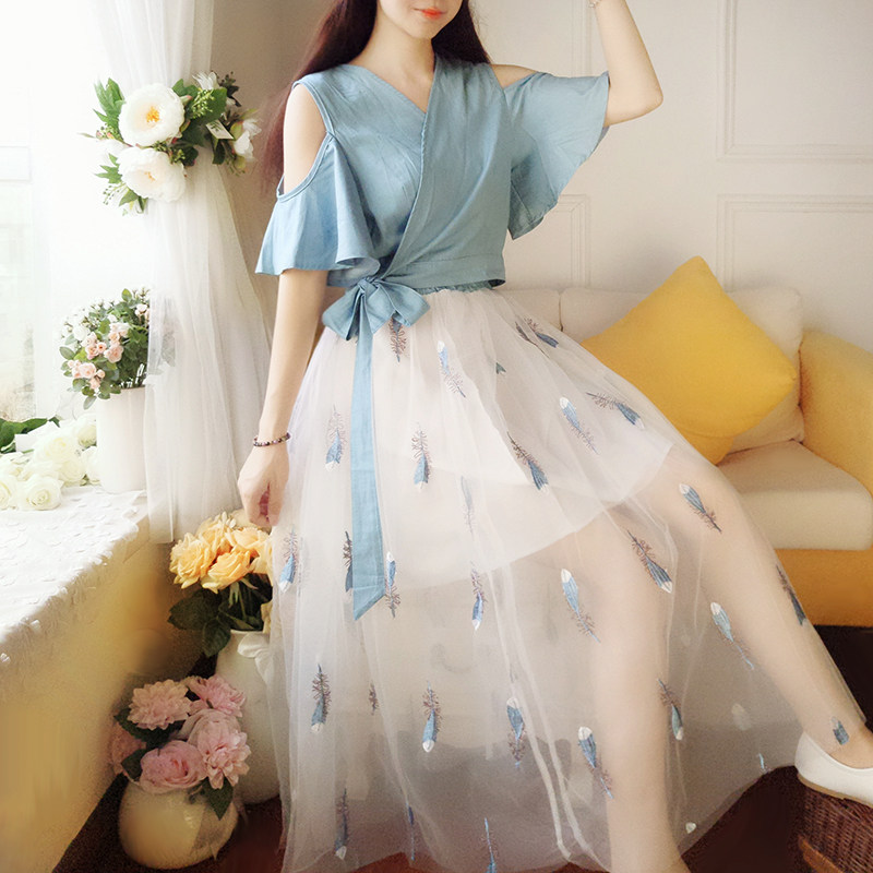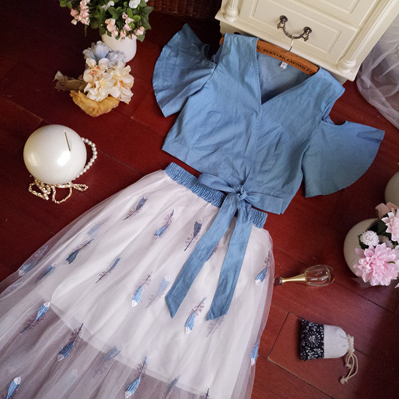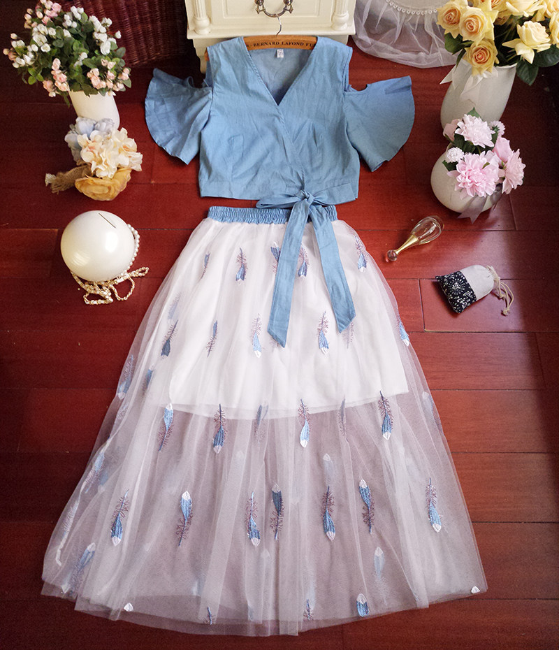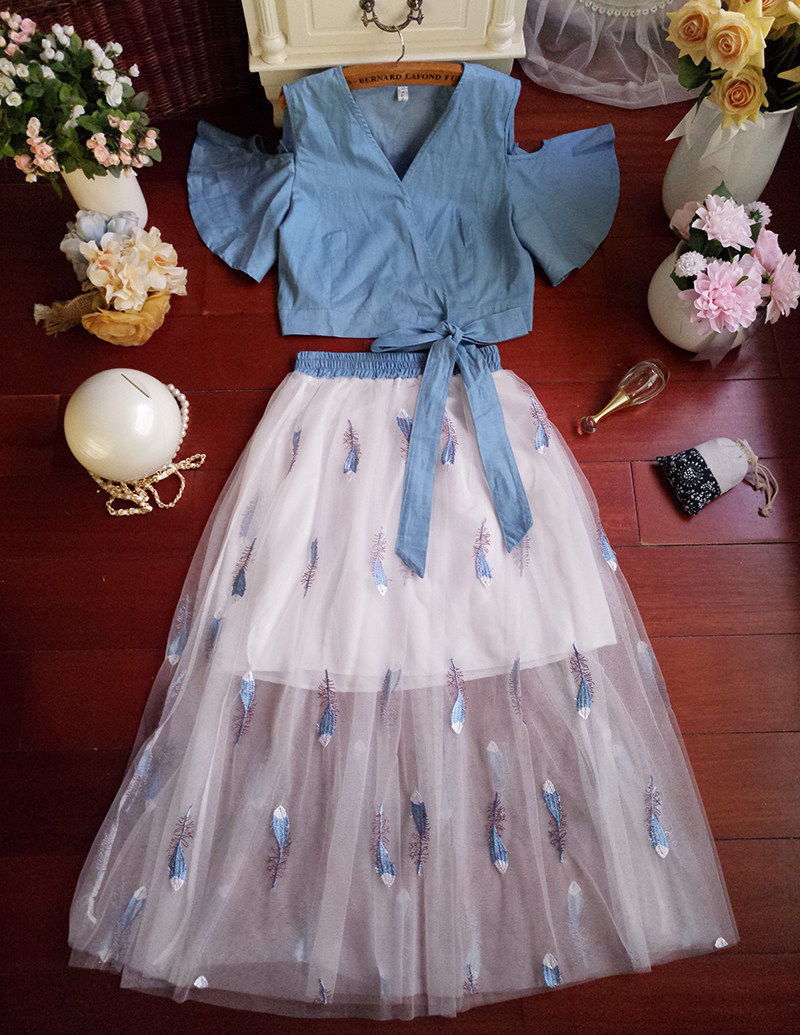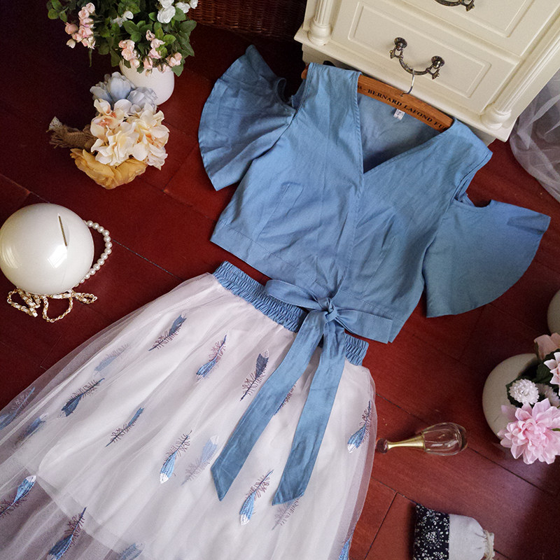 OLGITUM/Асимметричная футболка + сетчатая юбка, костюмы с бантом, однотонные топы, винтажная вышивка, Цветочная юбка, наборы, элегантная женская юбка, набор WS114