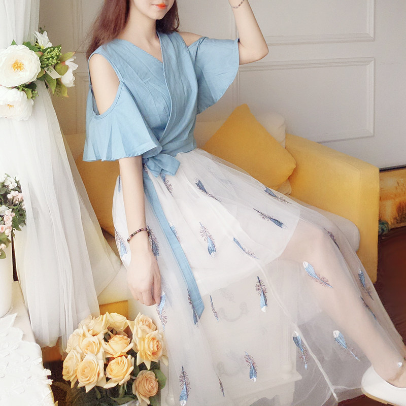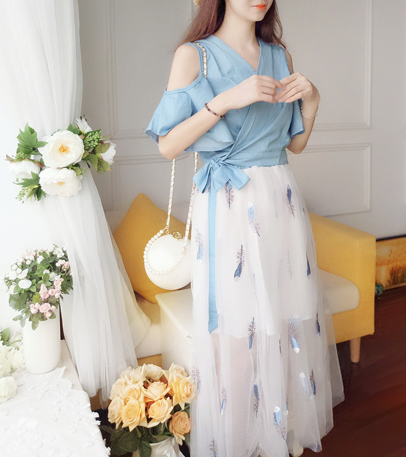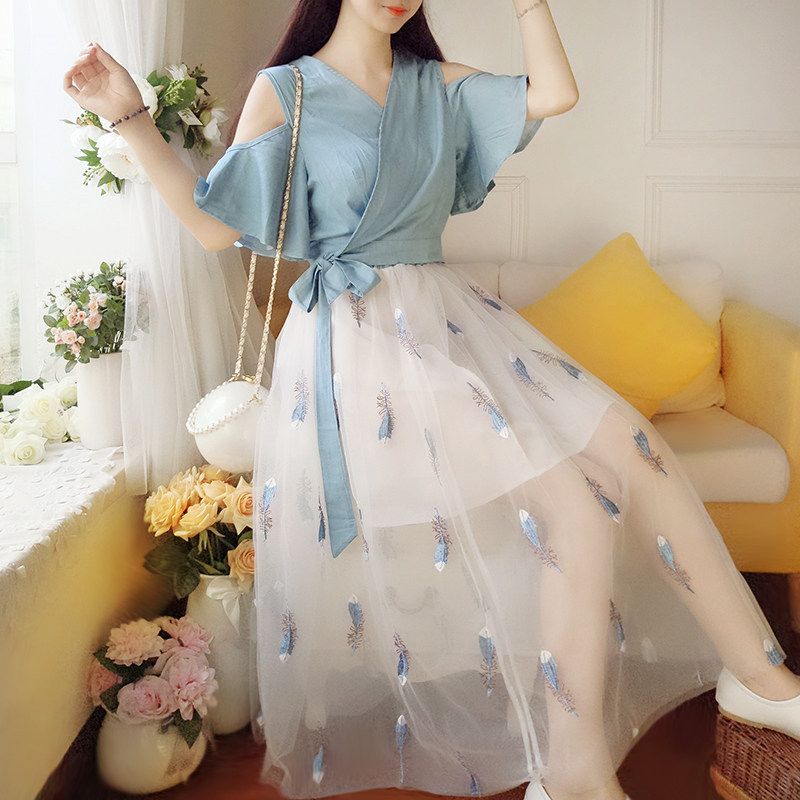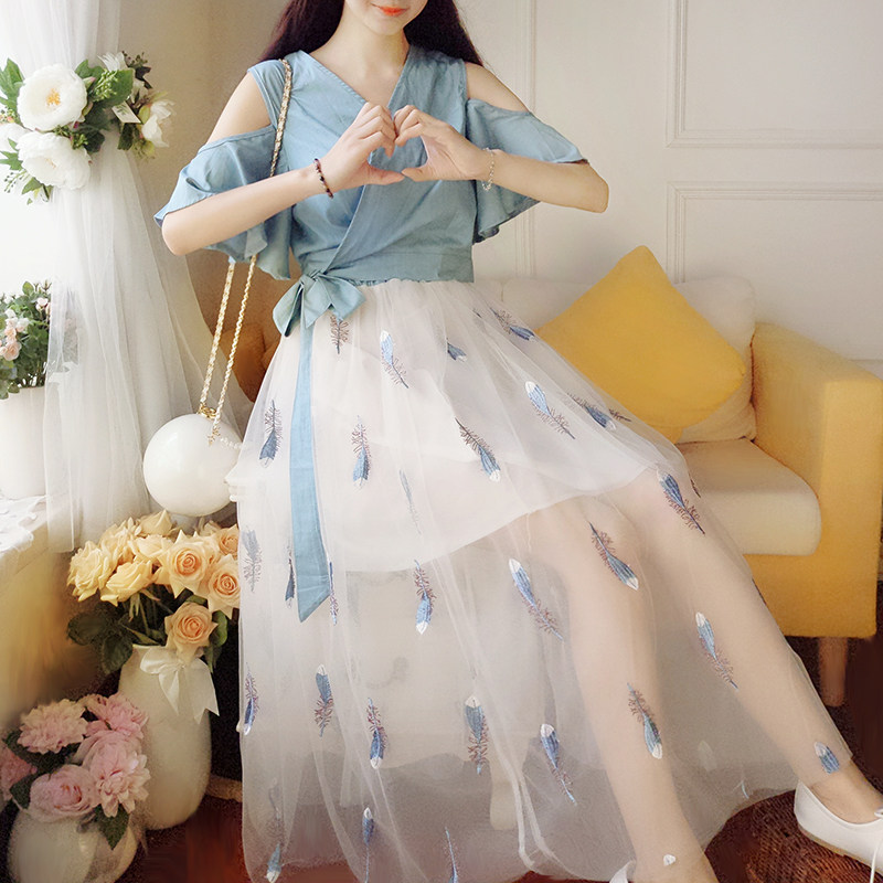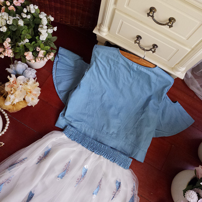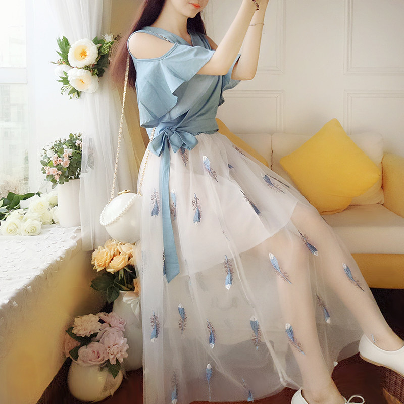 OLGITUM/Асимметричная футболка + сетчатая юбка, костюмы с бантом, однотонные топы, винтажная вышивка, Цветочная юбка, наборы, элегантная женская юбка, набор WS114