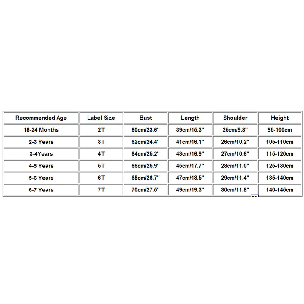 | Рекомендуемый возраст:От 6 до 7 лет | Размер этикетки: 7 T | Обхват груди: 70 см/27,5" | Длина: 49 см/19,3" | Плечо: 30 см/11,8" | Высота: 140-145 см |