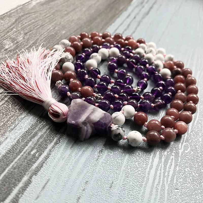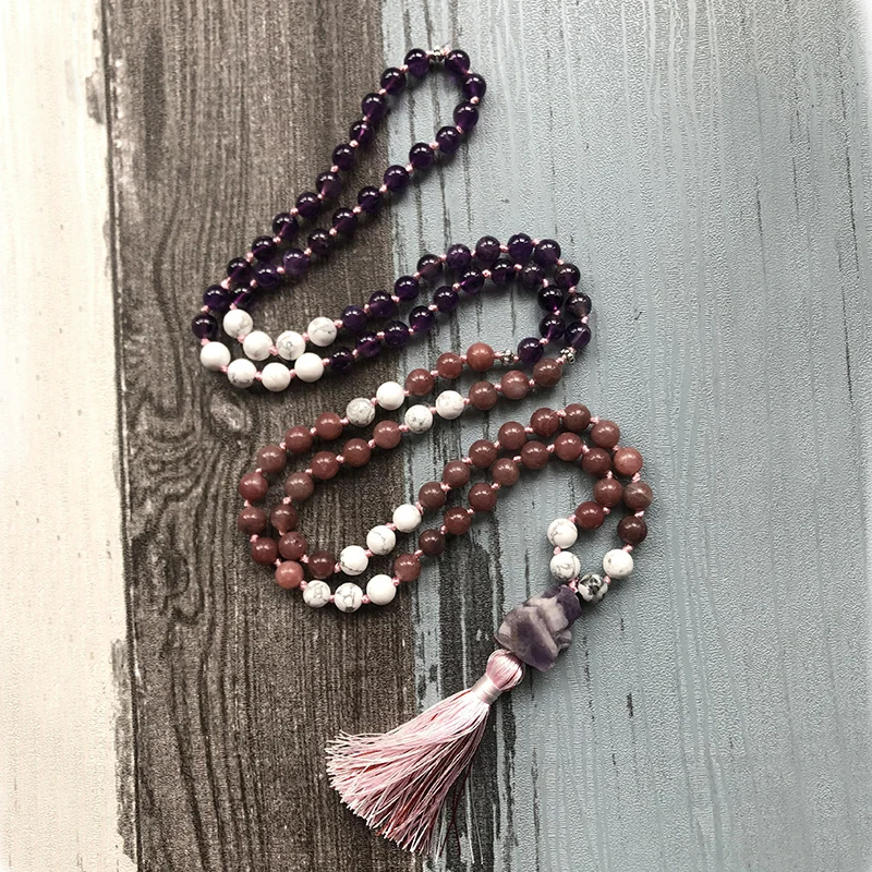 Изделие: ожерелье из сырого камня, ювелирное изделие, 108 малы, бусы, ожерелья, аметисты, Howlite, узелковая кисточка, ожерелье для женщин