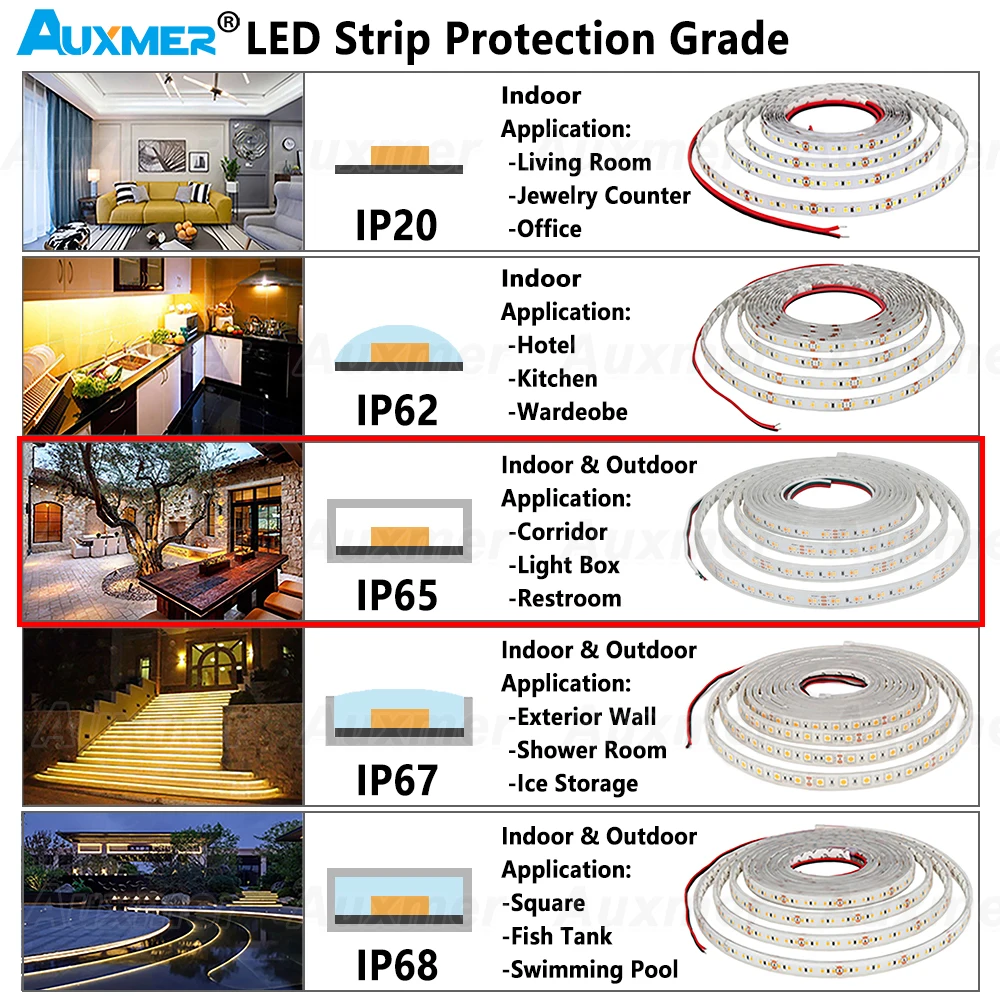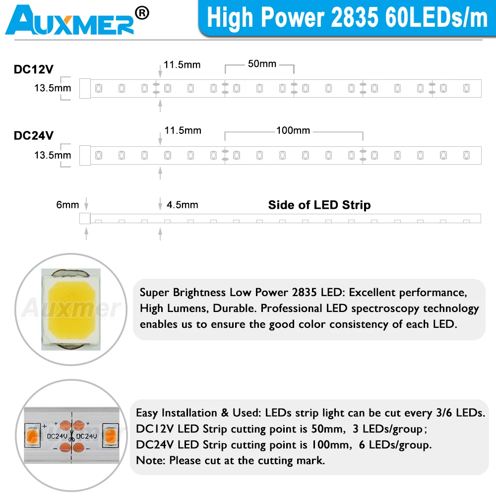 Auxmer такая же спецификация Светодиодная лента делится на входное напряжение DC12V и DC24V. Они имеют только различное входное напряжение. Но мощность, размер и эффективность работы одинаковы.