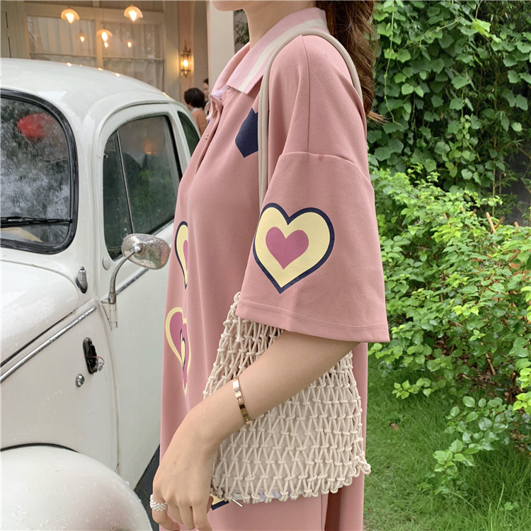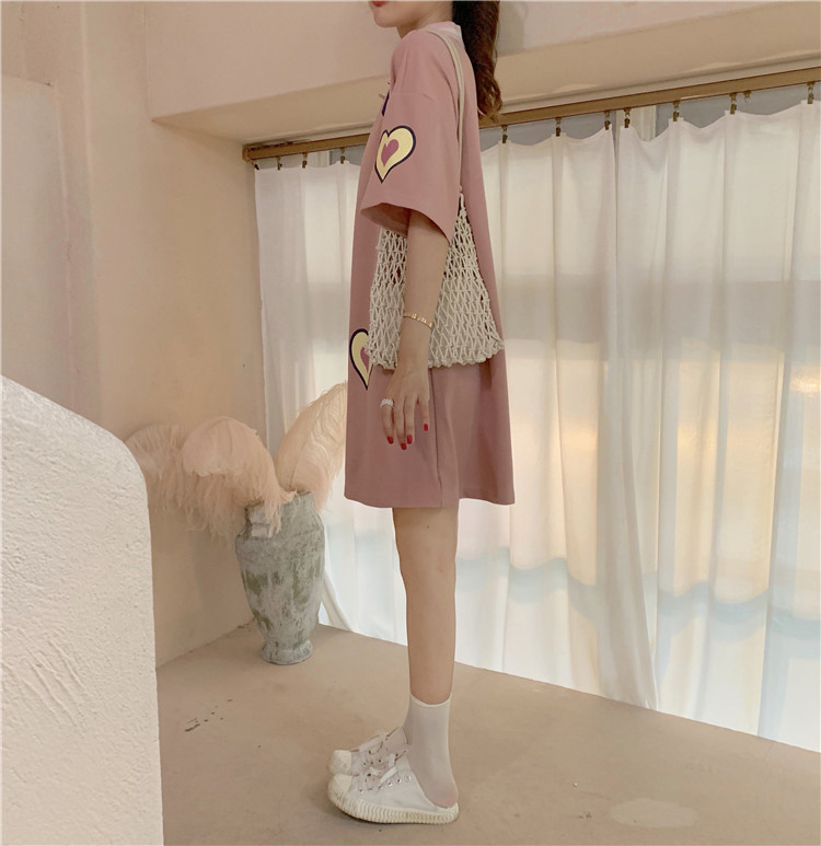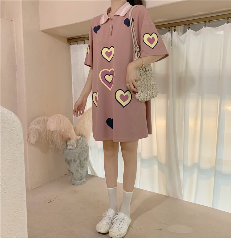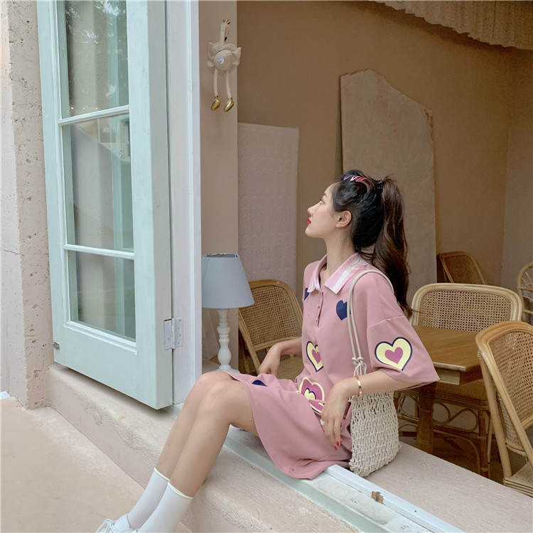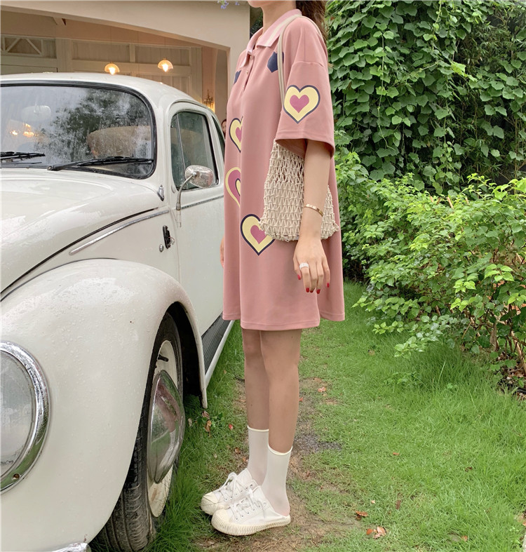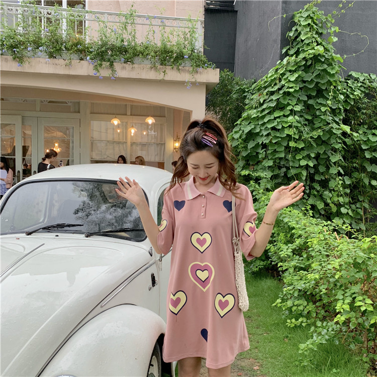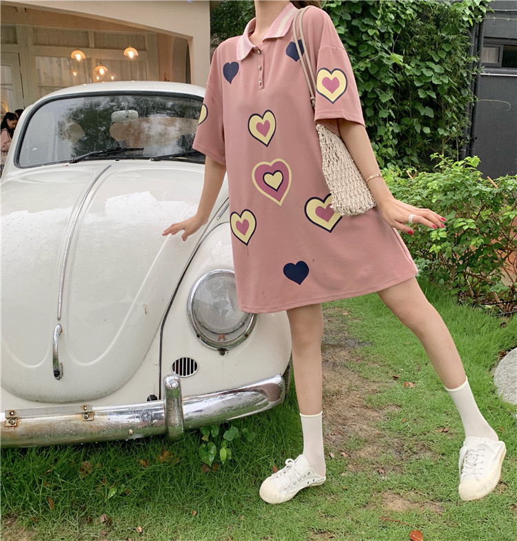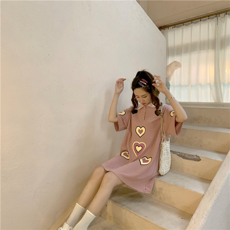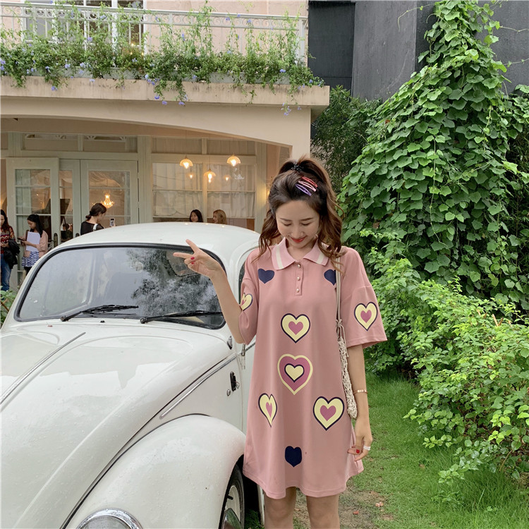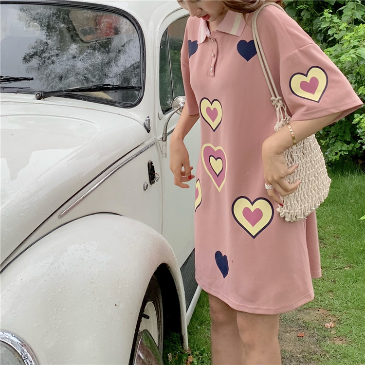 Розовая футболка платье 2019 корейский улица breif стиль сердце любовь печати короткий рукав Мини Летние платья женские