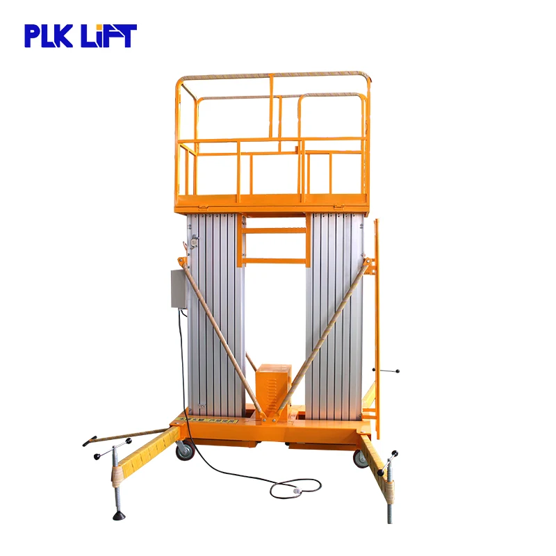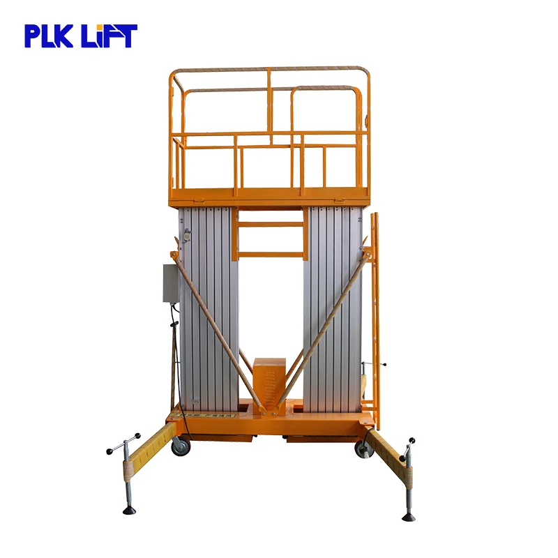 Двухмачтовая алюминиевая подъемная платформа Разработано с одной мачты алюминиевой подъемной платформы. По сравнению с одной мачтой алюминиевой подъемной платформой, двойная мачта грузоподъемностью 200 кг, высота подъема от 6 м до 14 м.