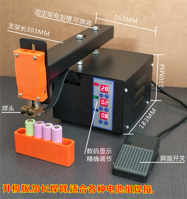 JST-IIS Модернизированный сварочный аппарат принимает фиксированную сварочную головку типа кронштейна, удлиняет расстояние сварки и точную точечную сварку с помощью ножного переключателя. Технические параметры: Вход мощность: AC220V/110V Выход мощность: 3KW Сварочный ток: 01-99% регулируемый Регулировка импульса: 01-06 регулируемый Регулировка задержки: 01-99 регулируемый Посылка Вес: около 6 кг Размер корпуса: 183*164*130 мм (мм) Толщина сварки: подходит для никеля или стальными листами ≤ 0,15 мм. Применимые объекты: Мобильная мощность. Зарядное сокровище/Аккумулятор для ноутбука/цифровой батарейный блок/Аккумулятор для электроинструмента/модификация и техническое обслуживание аккумуляторного блока для электромобиля. Поддержка 18650 и других цилиндрических батарей или полимерных батарей (после никеля) сварки. Посылка включает в себя:1x сварочный аппарат1x приспособление с 6 отверстиями1x Шестигранный ключ, дюймовый стандарт1 припой 4 шт.1x предохранитель 2 шт.1x0,1*4 никелевая пластина 100 шт