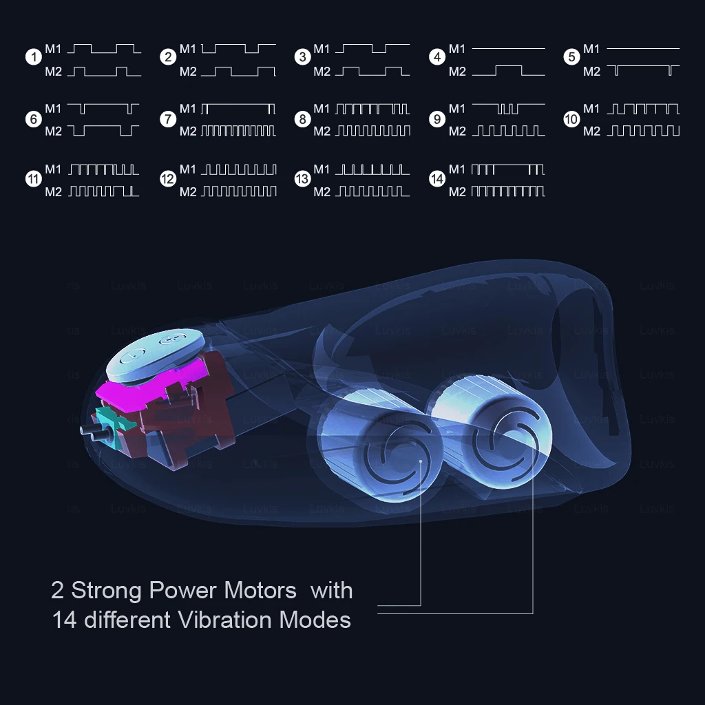 МОЩНАЯ ВИБРАЦИЯ с двумя встроенными двигателями, максимальная рабочая скорость до 11000 ± 10% об/мин с 14 различными режимами вибрации