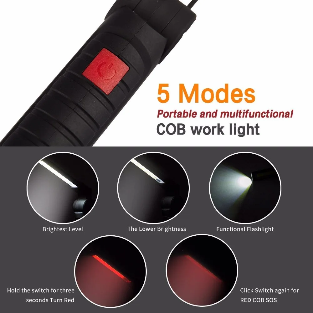 Пластиковый корпус, завернутый в слой черного углерода, приятный на ощупь, не скользит. Поставляется с магнитом и крючком, складной дизайн, прост в использовании в небольшом пространстве внутри. Высокий COB LED, низкий COB LED и LED свет 3-различные способы освещения для удовлетворения ваших потребностей в освещении. Светодиодные лампы, зеленый энергосбережение и охрана окружающей среды, использование более длительного времени. Встроенный аккумулятор, вы можете использовать usb-кабель для зарядки. Примечание: маленький Штепсель для пыли без USB
