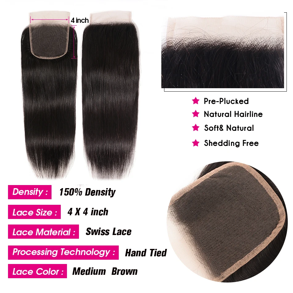 UNICE волосы прямые волосы пучки с 4х4 закрытие бразильские волосы плетение пучки 4 шт. Remy человеческие волосы 3 пучка с закрытием