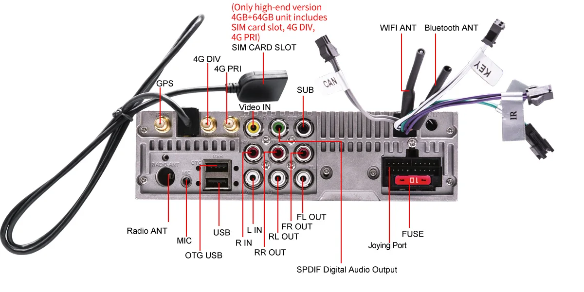 1) Видео Выход 2)DVD/CD слот 3)iPod 4) Оригинальная Автомобильная GPS антенна 5) Оригинальная Автомобильная камера заднего вида 6) оригинальный автомобильный Bluetooth 7) Оригинальный Автомобильный USB 8) оригинальный автомобильный микрофон 9) регулировка чувствительности микрофона 10)4G sim-карта/4G сеть 11) слот TF/Micro SD