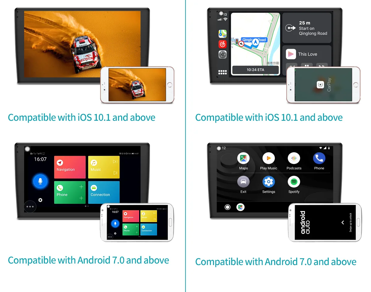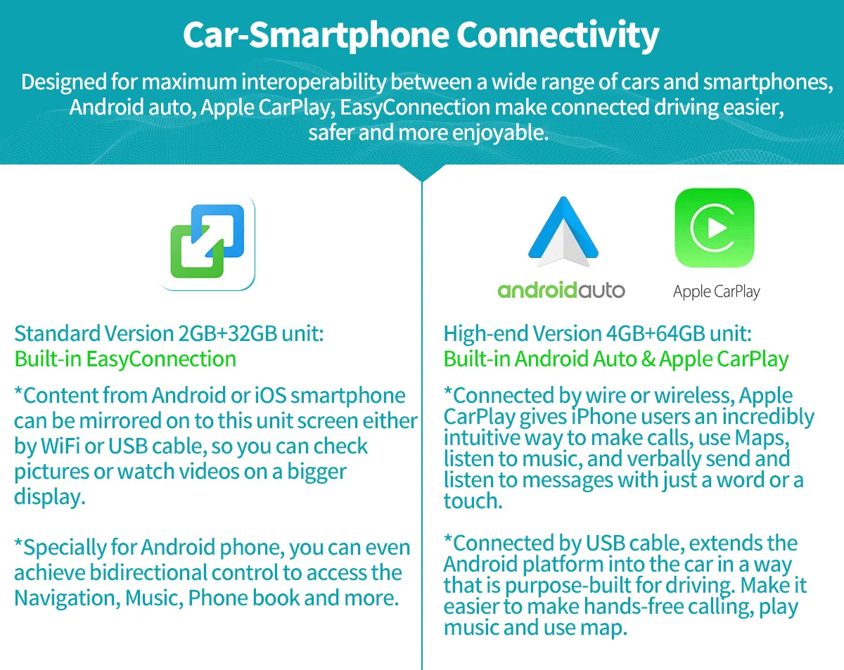 Версия 2 + 32 ГБ поддерживает Mirror Link(EasyConnection). Содержимое вашего телефона может отображаться на экране Нашего Радио android, чтобы наслаждаться большим дисплеем. 1) поддержка телефона Android через WiFi или usb-кабель (совместим с Android 7,0-10,0). 2) поддержка iSO телефона через WiFi или USB кабель (совместим с iOS 10,1-13,2). Версия 4 + 64 ГБ поддерживает Carplay и Android auto. Вы можете использовать приложения, которые находятся на вашем телефоне, прямо на нашем android радио. 1) Поддержка Carplay через Bluetooth и usb-кабель (совместим с iSO 10,1-13,2). 2) Поддержка Android auto через USB кабель (совместим с Android 7,0-10,0).