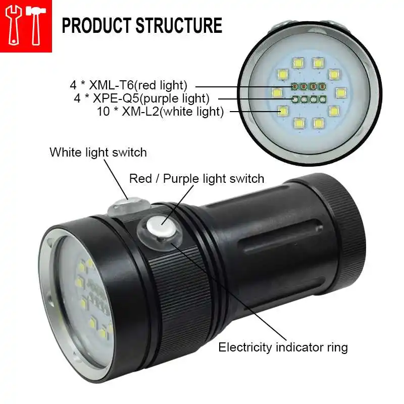 Подводной фотографии видео заполнить фонарик для подводного плавания 10 * L2 + 4 * R + 4 * UV/фиолетовый световой факел Подводный фонарик лампа Особенности: 1. 100% абсолютно новый и качественный Professional Дайвинг фонарик водостойкий факел для подводного видео и фотографии. 2. Объектив: 6 мм поликарбонатная панель. 3. Двойная функция контроля безопасности: Этот легкий фонарик был защищен от неправильной установки батареи. 4. сверхглубокий Тренч структуры нескользящий эффект отлично подходит при дайвинге. 5. Обработка поверхности: жесткий анодирование премиум-класса. 6. износостойкий твердый и хороший отвод тепла, сопротивление ржавчине и коррозии. 7. длительный срок Светодиодный 100000 часов) и водостойкий анти-шок. 8. подходит для активного отдыха, таких как дайвинг, Подводная Работа, наземное освещение, кемпинг, альпинизм, рыбалка, или используется дома, как ремонт или поиск мелочи. Технические характеристики: 1. Название бренда: WasaFire 2. Модель: Multifunction Подводная фотосъемка 3. Лампа: 10 * белый XM-L2 светодиодный + 4 * красный светодиодный + 4 * УФ/фиолетовый светодиодный 4. 2 Переключатель: 1 переключатель 10 x L2 светодиодный 3 режима: High-Mid-Low 1 переключатель 3 режима: 4 x красный светодиод-4 x УФ/фиолетовый светодиод-стробоскоп 5. угол света: 120 ° 6. Питание: 4x18650 литий-ионная батарея (не включает) 7. Рабочее напряжение: от 2,8 В до 4,5 в 8. Водозащита: 100 м под водой 9. Вес нетто: 531 г Посылка включает: 1 х светодиодный фонарик для дайвинга (не включает аккумулятор или зарядное устройство)