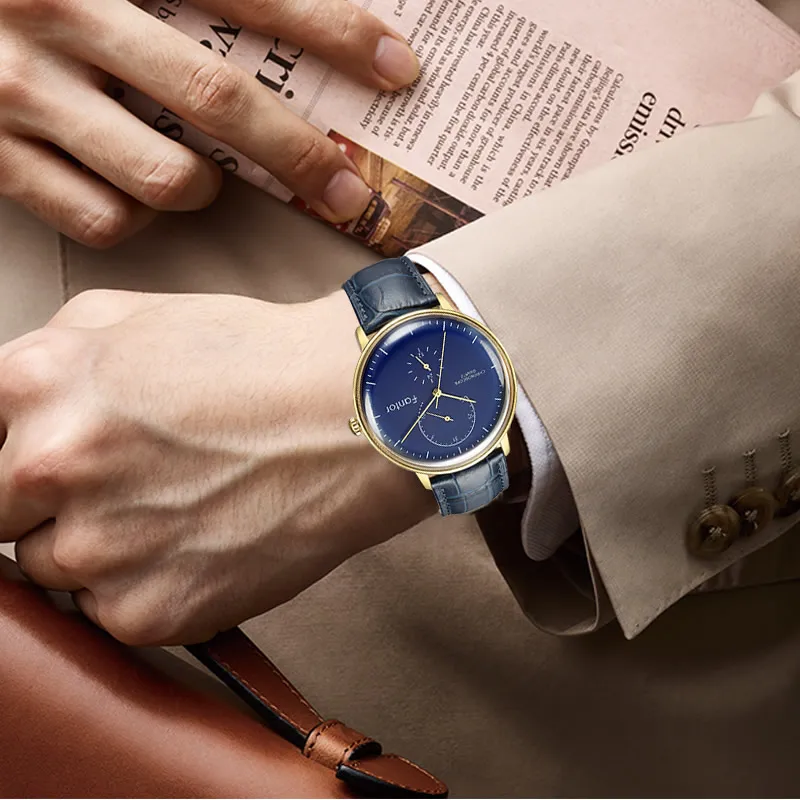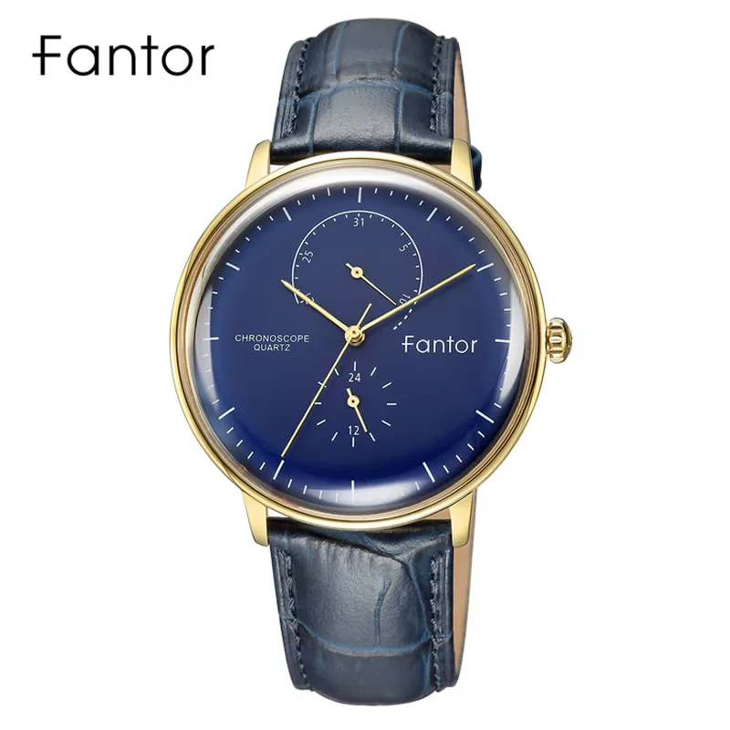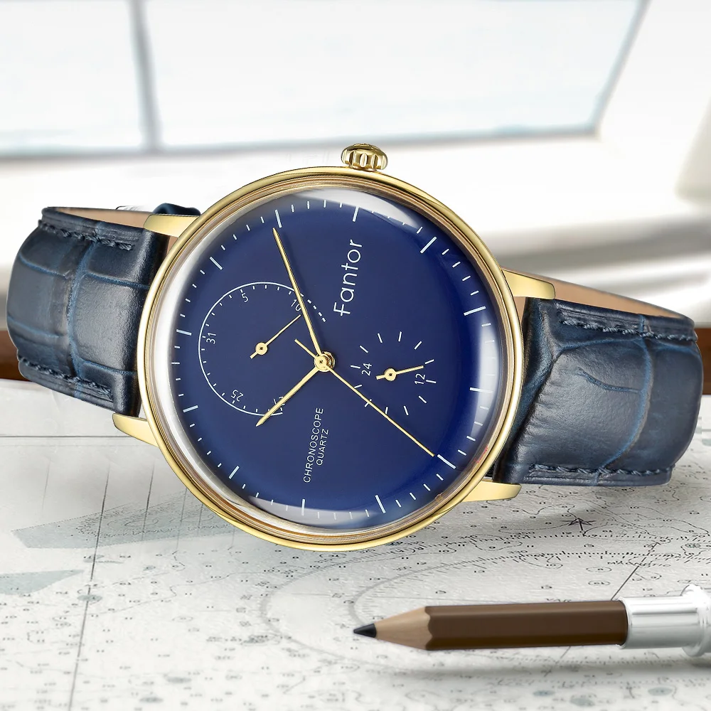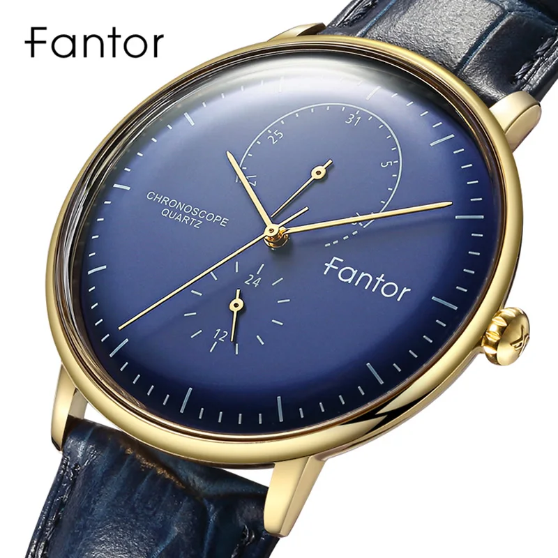 Fantor часы для мужчин синий циферблат водонепроницаемые кварцевые часы хронограф кожаный ремешок мужские модные наручные часы Reloj de hombre