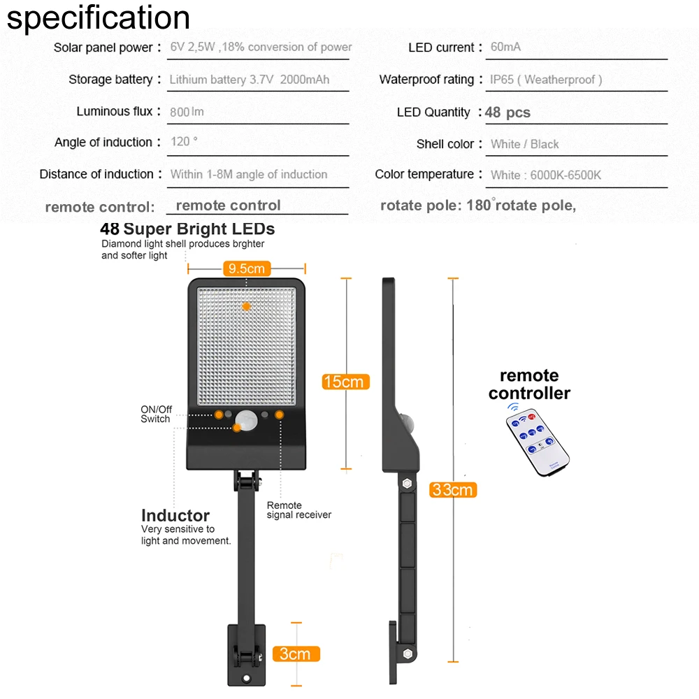 Спецификация: 1. Солнечная панель: 6 В/1,5 Вт 2. Выход: максимум 7 Вт 3. Батарея: литий-железо фосфатная батарея 2000 мАч 4. Светодиоды: 48 шт. 2835/0.2 Вт 30lm 6000k 5. Люмен: 900лм 6. Расстояние срабатывания: 6-10 м 7. Водонепроницаемость: IP65 8. Время зарядки: 6-8 часов Особенности: 1. По сравнению со старым стилем, этот солнечный светильник можно использовать в двух направлениях, более удобный для нас 2. Оснащено 48 светодиодами, более яркими, чем в старом стиле 48 светодиодов 3. Три режима на выбор, независимо от того, хотите ли вы режим датчика движения или режим управления светильник, этот продукт может удовлетворить ваши требования 4. Вы также можете включить/выключить или изменить режим с помощью пульта дистанционного управления, но, пожалуйста, снимите пластик на пульте дистанционного управления, И вам нужно нажать кнопку ВКЛ/ВЫКЛ на изделии в течение 5-10 секунд, чтобы включить его в первый разОтзывы о других товарах