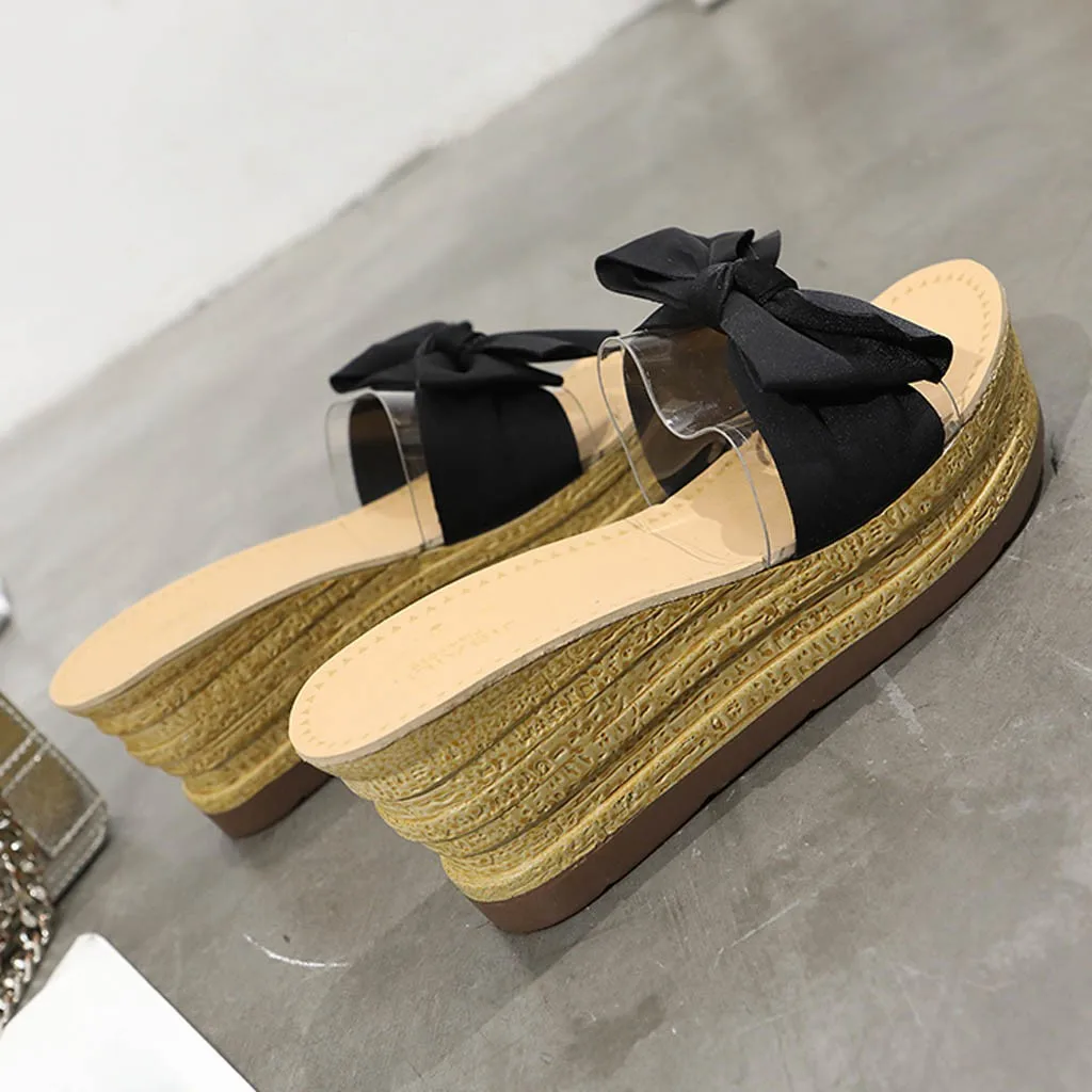 Летние женские шлепанцы на танкетке; прозрачные шлепанцы на платформе с бантом; пляжные шлепанцы