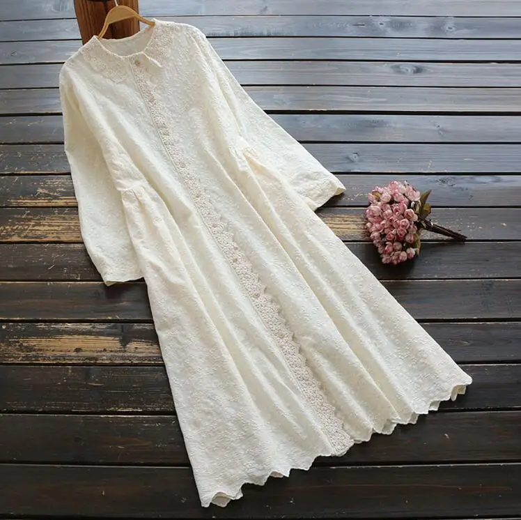 Женское винтажное платье Mori Girl, хлопковое кружевное платье с вышивкой и длинными рукавами, Осеннее Свободное платье, 2019