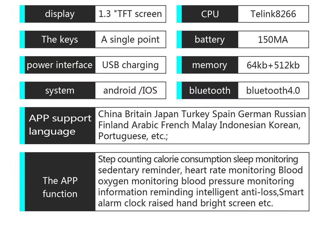 Особенности: 1. Спортивная запись: шаги, Километры, калории. 2. Эффективный мониторинг качества сна, пульса, кровяного давления и насыщения крови кислородом. 3. Сообщение в режиме реального времени, синхронный просмотр информации. 4. Напоминание о функциях сообщений, телефонных звонков и чрезмерном сидении. 5. Идеально подходит для различных упражнений на открытом воздухе, таких как бег, Велоспорт, альпинизм и т. д. Технические характеристики: Тип изделия: умный Браслет Материал корпуса: АБС-пластик Материал браслета: силикон Цвет: синий/черный/красный/фиолетовый/зеленый (опционально) Экран дисплея: 1,3 "на тонкопленочных транзисторах на тонкоплёночных транзисторах Версия Bluetooth: V4.0 Емкость аккумулятора: 150 мАч Память: 64 КБ + 512кб Тип интерфейса: USB Поддерживающая система: для iOS, Android Примечания: 1. Пожалуйста, учитывайте погрешность в 1-3 см из-за ручного измерения и убедитесь, что вы не возражаете перед заказом. 2. Из-за разницы в освещении и экране цвет изделия может немного отличаться от изображения. Комплектация: 1 x смарт-браслет Руководство пользователя (1 шт.)
