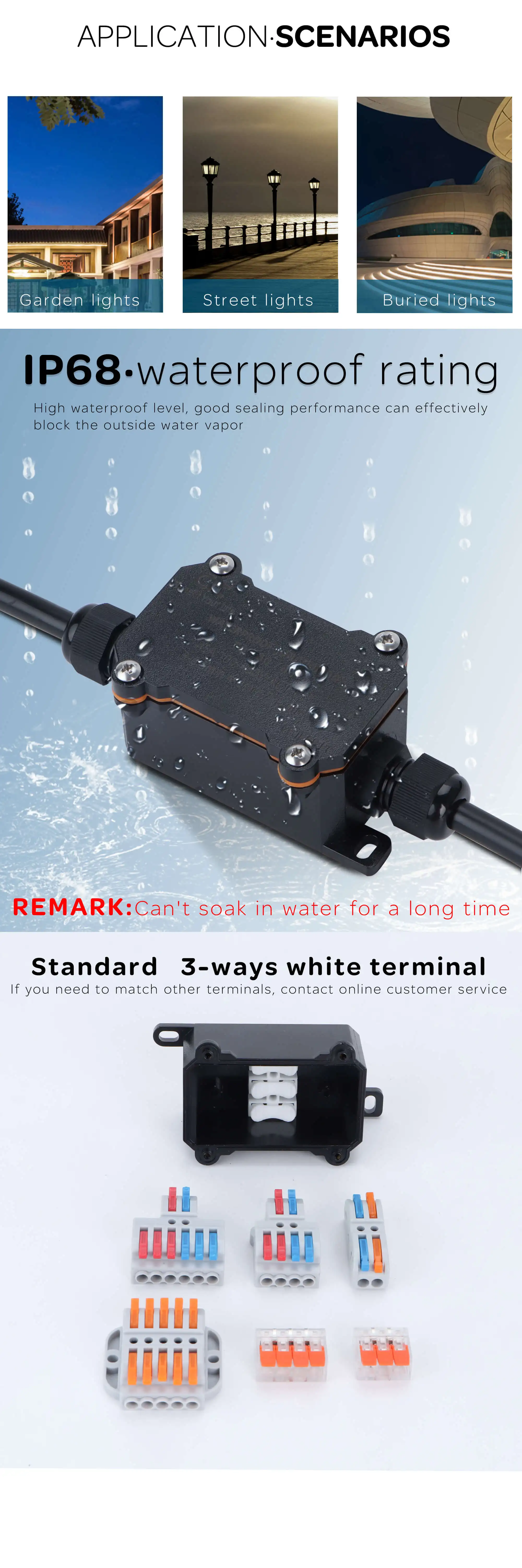 Класс водонепроницаемости IP68 высокого уровня/влагостойкий/пыленепроницаемый/анти-УФ пластиковый терминал, он может быть установлен как внешняя распределительная коробка, широко используется в открытых водонепроницаемых помещениях, уличных фонарях, похороненных огнях, садовые фонари, наружные прожекторы и т. Д.