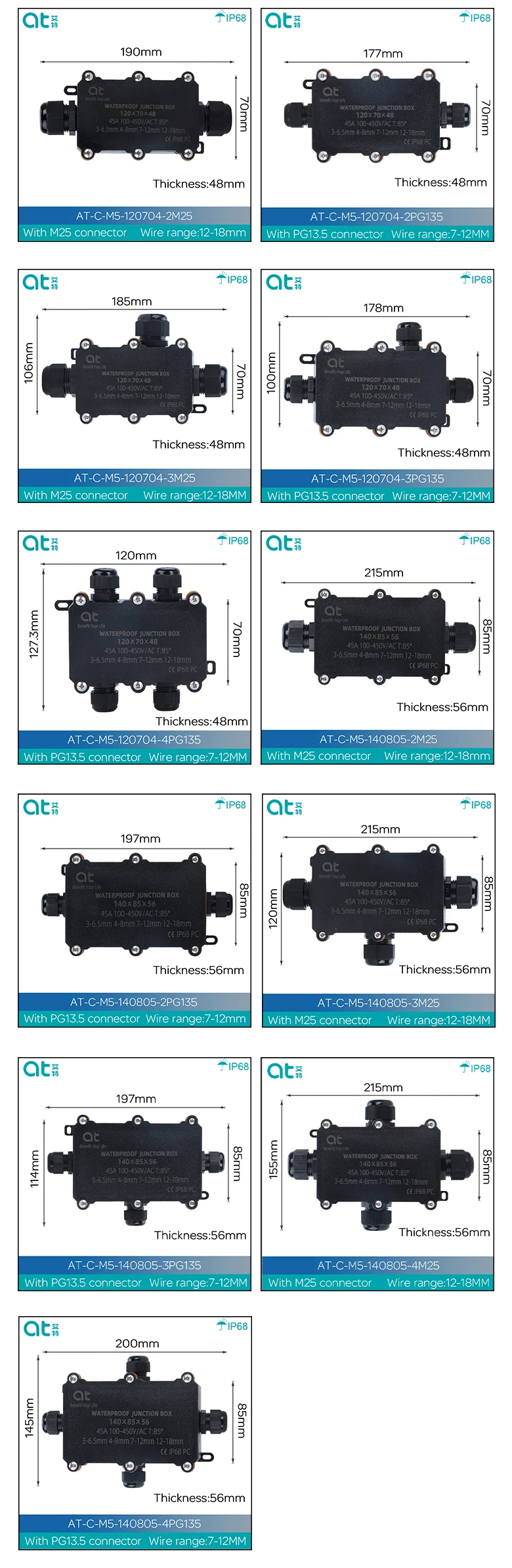 Доступный провод Диаметр: 2,5 ~ 6 мм, 4 ~ 8 мм, 7 ~ 12 мм, 12 ~ 18 мм