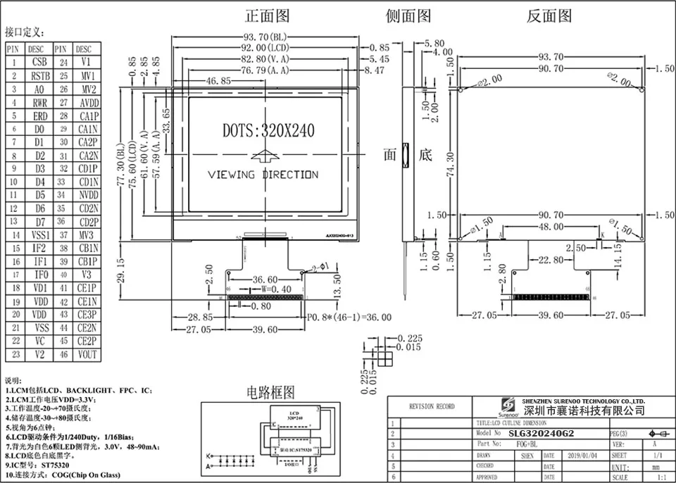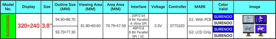 Model номер модели: SLG320240G Type тип продукта: графический ЖК-модуль ➤ Торговая марка: Surenoo Format Формат дисплея: 320*240 точек ➤ Интерфейс: параллельный IC или эквивалент: ST75320 или равный Dimension Габаритные размеры (G1): 94,90 (W)x86.70(H)x9.50(T) мм Dimension контурный размер (G2): 93,70 (W)x77.30(H)x5.80(T) мм Visual визуальная площадь: 81.80x60.60 мм Active Активная область: 76.79x57.59мм Direction направление обзора: 6:00 IC посылка: COG ➤ Питание (Тип): 3,3 V | |