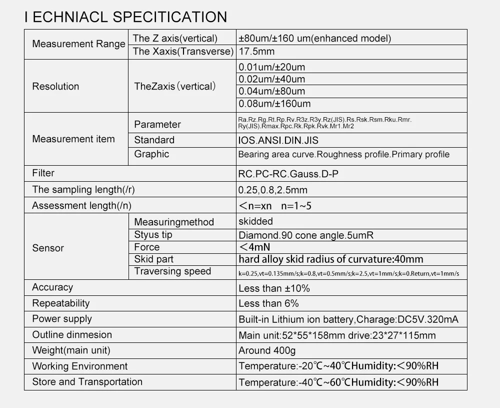 Rz,R3z,Ry,Rt,Rp,Rm | 0.02μm ~ 160μm |