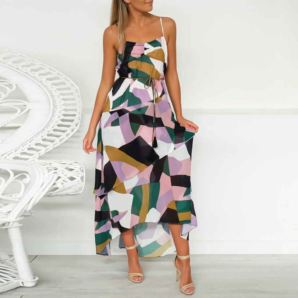 Особенности: асимметричное, платье на бретельках, многослойное, бандаж на поясе, принт, длинное платье, пляжный стиль, оборки, пикантная одежда, летнее и весеннее платье.