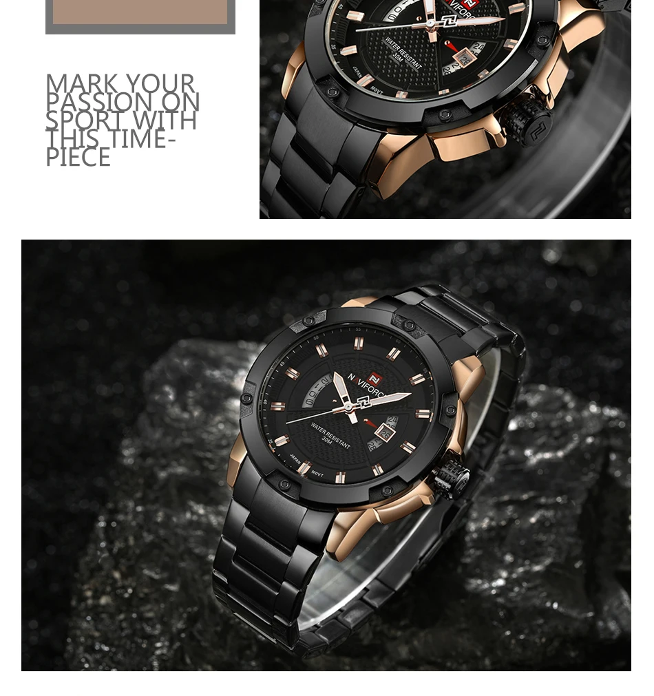 Описание продукта: NAVIFORCE 9085 -Чехол Диаметр: 46,5 мм -Чехол Толщина: 14 мм -Ширина ремешка: 24 мм -Длина ремешка (чехол входит в комплект) : 230 мм -Вес часов: 163 г -Материал ремешка: нержавеющая сталь -Регулируемый ремешок: Да -Питание от высококачественных импортных японских Movment и аккумуляторов -Автоматическая функция даты и недели -3 АТМ водонепроницаемости (не для душа и плавания) Характеристики: дисплей даты и дня, водонепроницаемый, ударопрочный Посылка включает в себя: 1x100% армейские часы мужские часы 1 х Руководство и гарантийный талон