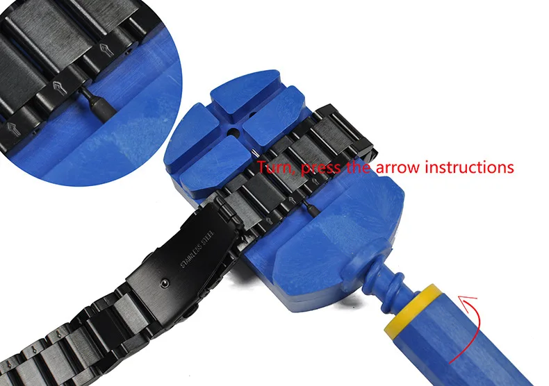 Способ использования: прост в использовании, вы можете понять с первого взгляда. Расправьте ремень непосредственно к штифту выталкивателя разъединителя и поверните рукоятку непосредственно. 1. Отвинтите ручку разъема 2, поместите ремешок в "щелевой" разъём 3. Выровняйте маленький стилус между ремнями, которые необходимо снять, прикрутите ручку съемника и вытолкните маленький стилус.