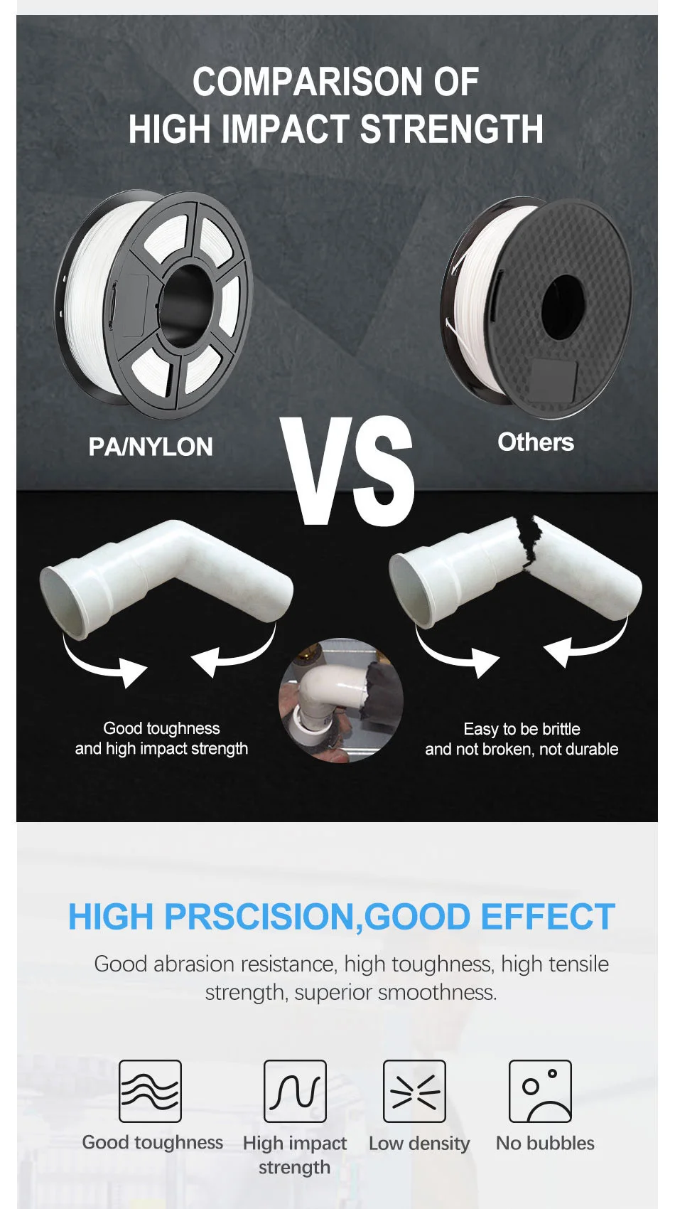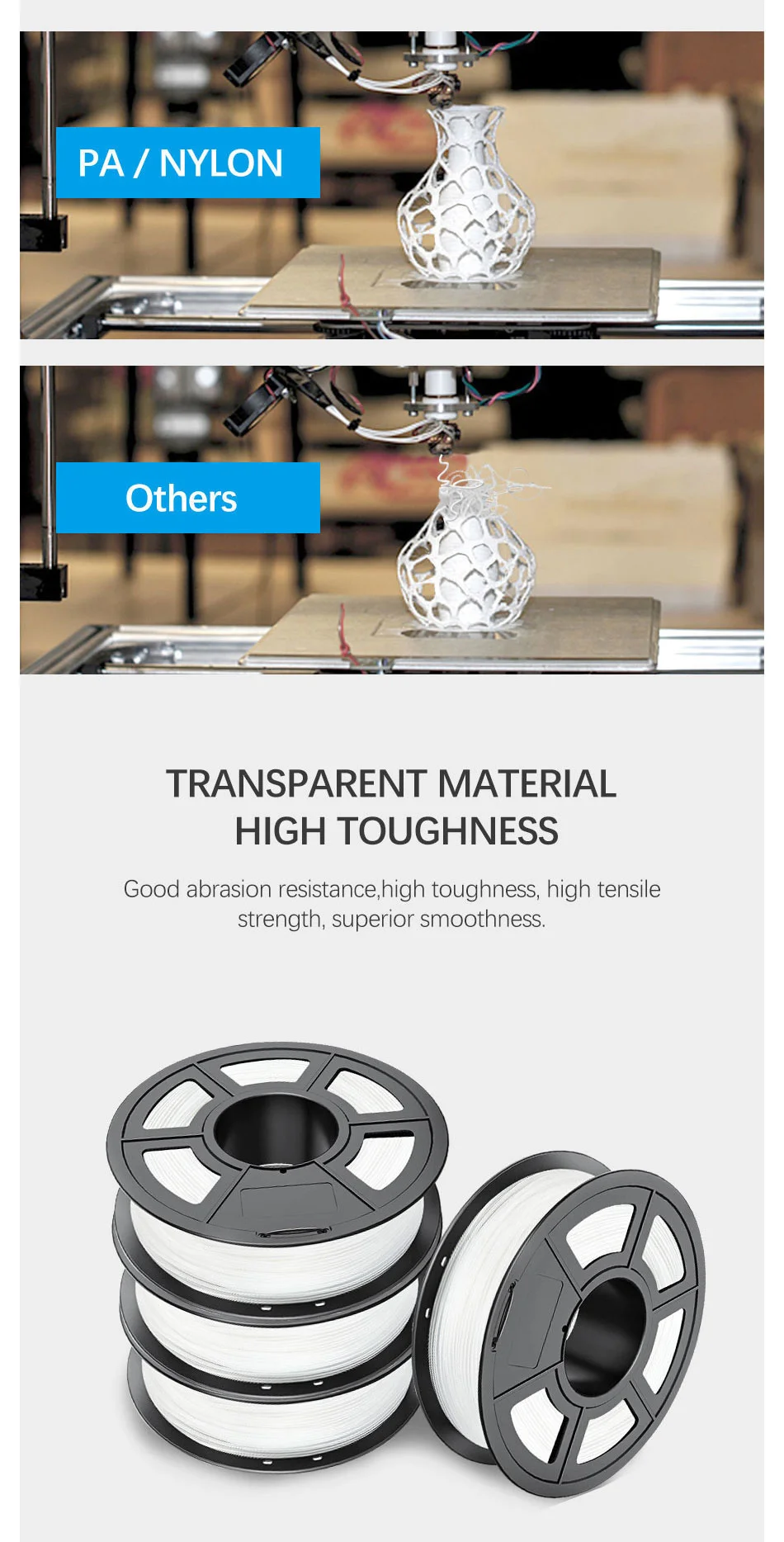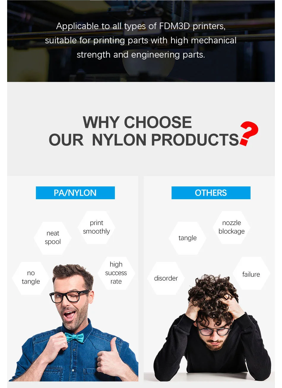 PA нейлон V2 нить хорошая стойкость к истиранию, высокая прочность, высокая прочность на растяжение, превосходная гладкость. Он может печатать модели имеют специальные требования emvironment, такие как: инженерные части. Также можно напечатать прозрачные прочные предметы домашнего обихода, такие как: абажур для вазы. 100% без пузырьковой 3d нити принтера.