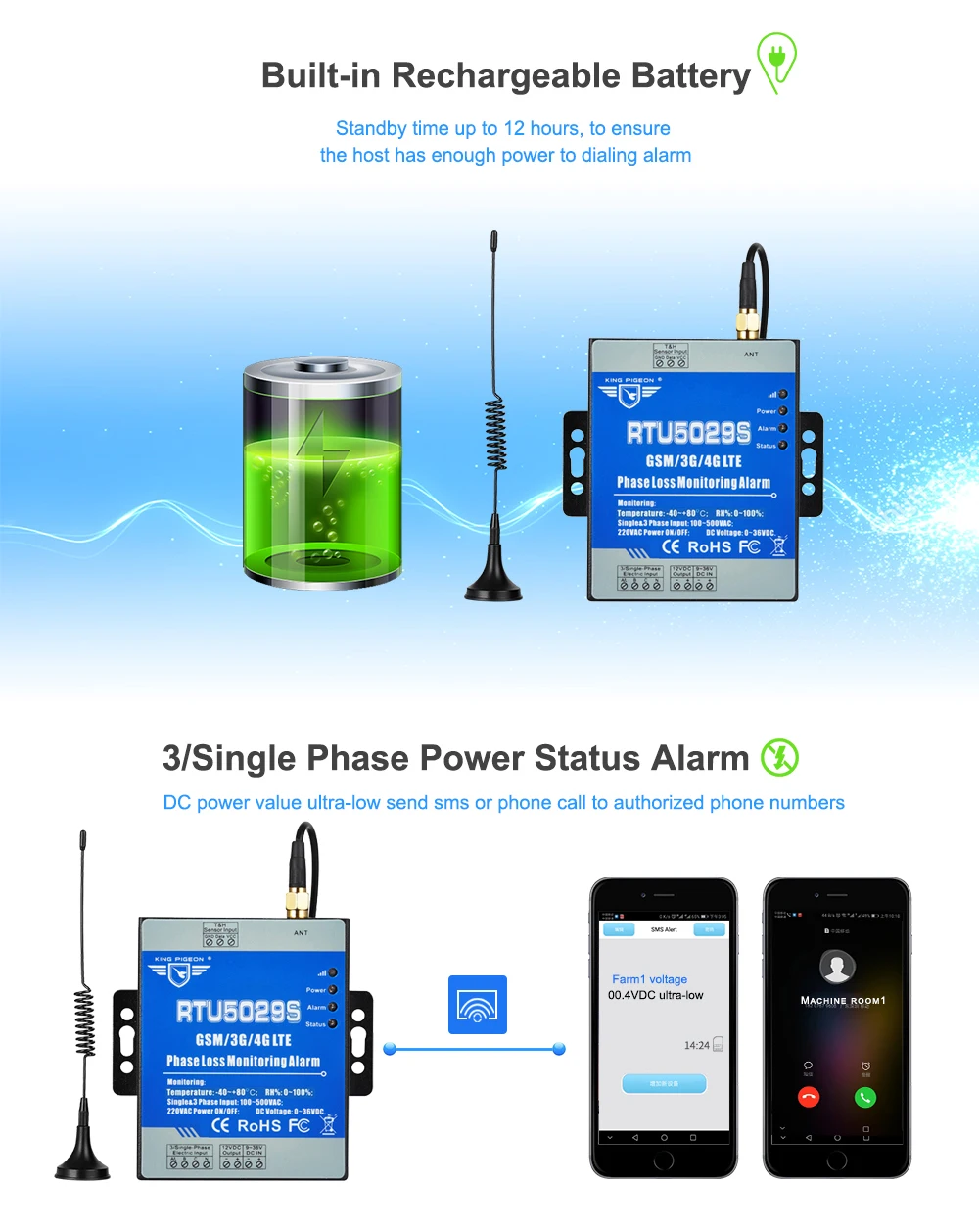 Просто наберите с авторизованного номера пользователя, GSM 3G 4G LTEСигнал наблюдения за потерей фазыБудет отклоняться при первом «кольце», без стоимости связи, а затем вернуть текущее состояние 3/одной фазы, состояние питания или напряжение. Более того, он может сообщать о интервале окружающей среды на месте или ежедневно.