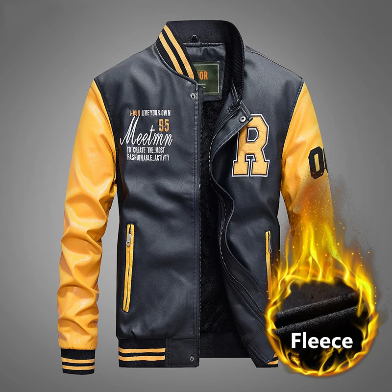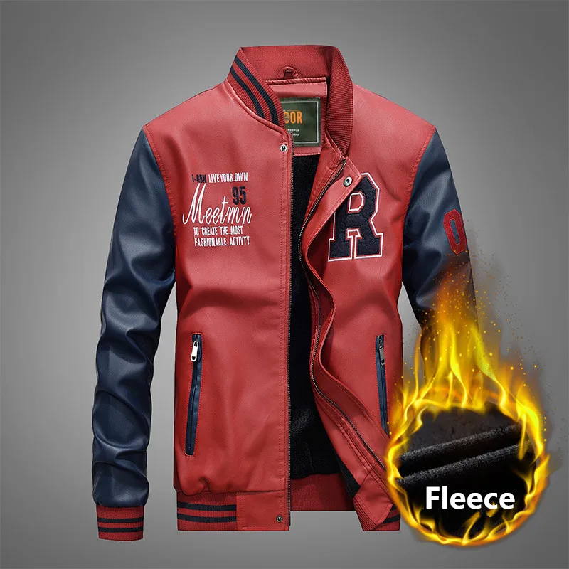 Men Baseball Leather Jacket Embroidered Pu Motorcycle Coats Slim Fit College Fleece Luxury Jackets Men's Stand Collar Top Jacket