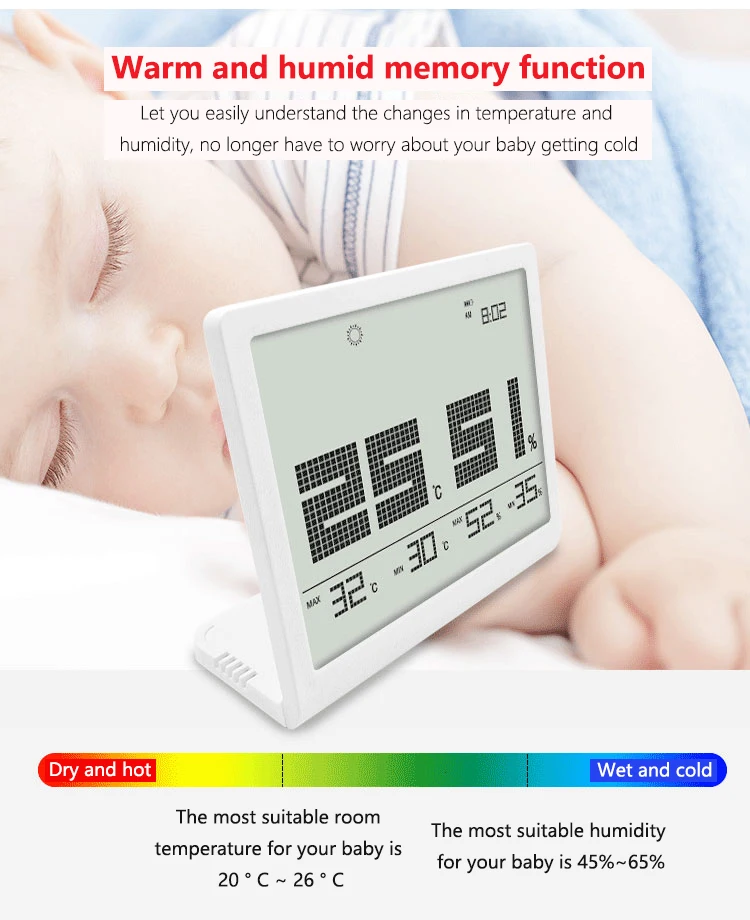 1. Большое окно + креативный шрифт. Ультра-узкий ободок создает большую площадь окна CH-906 2,10 точные отверстия для забора воздуха. Пять прецизионных отверстий слева и справа, не только красивые, но и обеспечивают точность данных измерений. 3. Функция теплой и влажной памяти Позвольте вам легко понять изменения температуры и влажности, больше не нужно беспокоиться о том, что ваш ребенок будет холодно Сухой и горячий Влажный и холодный Наиболее подходящая температура для вашего ребенка-20 °C ~ 26 °C Наиболее подходящая влажность для вашего ребенка составляет 45% ~ 65% 4. Минималистский дизайн Ультратонкий дизайн 5 мм Температурный дисплей Дисплей влажности Функция памяти Дисплей питания Время Прогноз погоды