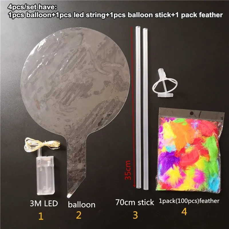Упаковка: 1 воздушный шар + 1 шариковая палочка 70 см + 1 перо + 1 Светодиодная лента 3 м (без аккумулятора)